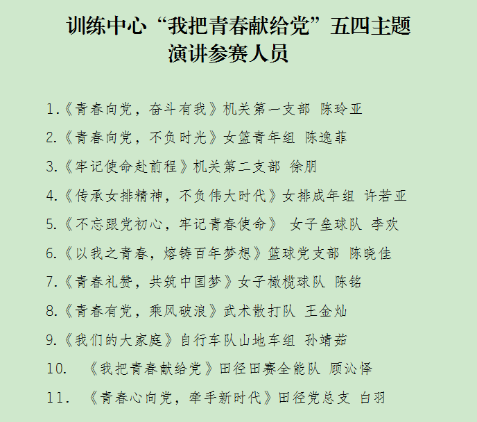 4月30日上午,江苏省体育局训练中心举行庆祝建党百年系列主题活动——“我把青春献给党”五四主题演讲比赛,来自体育局训练中心内7个项目中心及5个党支部的全运会冠军、青年党员和青年团员共11名选手参加,南京工业大学江苏女垒党支部选派队长李欢参加这次比赛,她以《不忘跟党初心,牢记青春使命》为题,在众多参赛选手脱颖而出,荣获此次演讲比赛第一名。