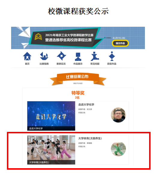 在创新课程的教学模式中,学生强化了对武德思政的学习,传统文化太极拳的魅力得到了更好地传承和弘扬,传统教学的发展方向进一步地拓宽。通过课程的学习与实践,五名优秀拔尖学生在2021年中国大学生武术套路锦标赛中获得了6金2银1铜的好成绩。2021年7月章璐璐老师的大学体育(太极养生)课程也获得校级微课程教学比赛特等奖,还多次获得其他校级和省级的优秀奖项,希望她再接再厉、再创佳绩。