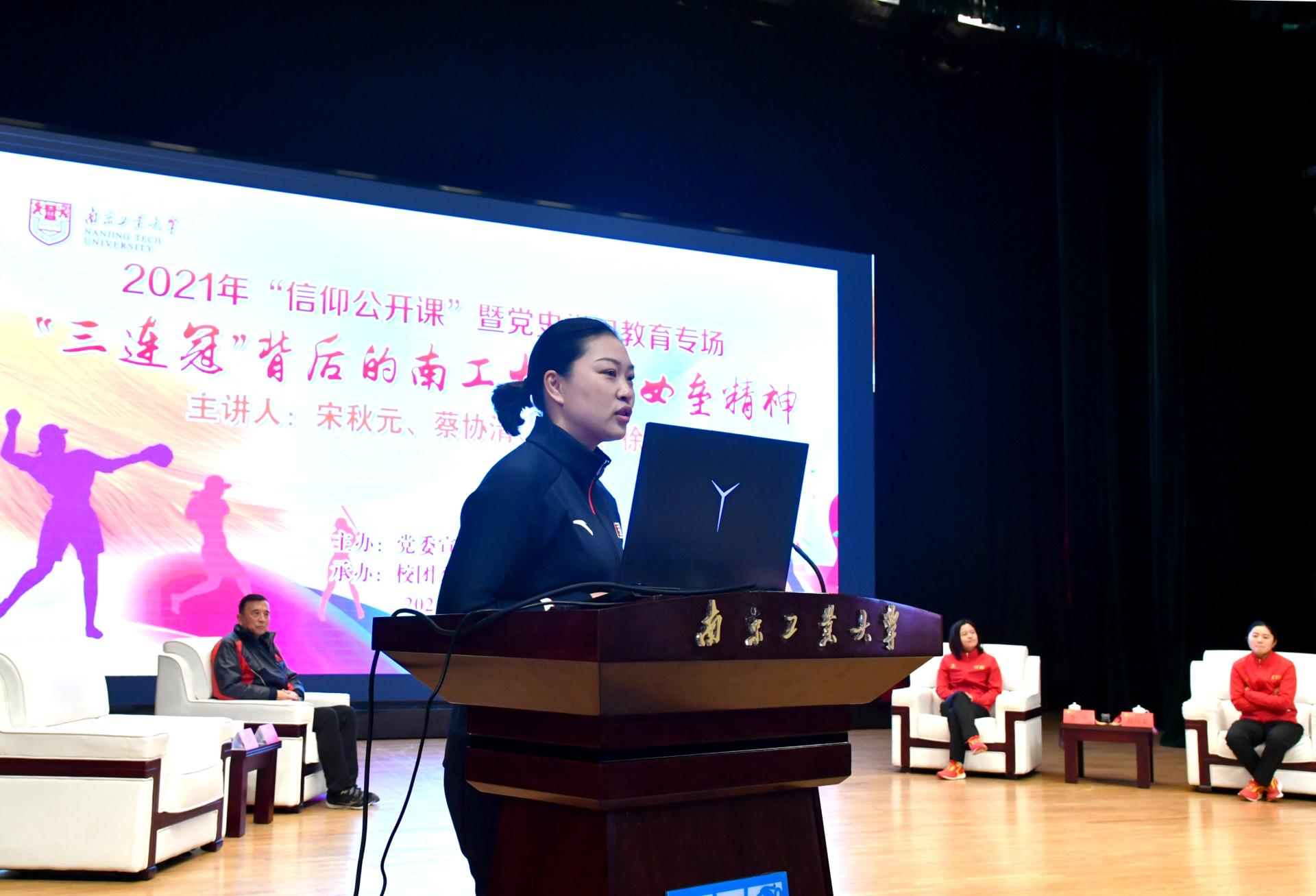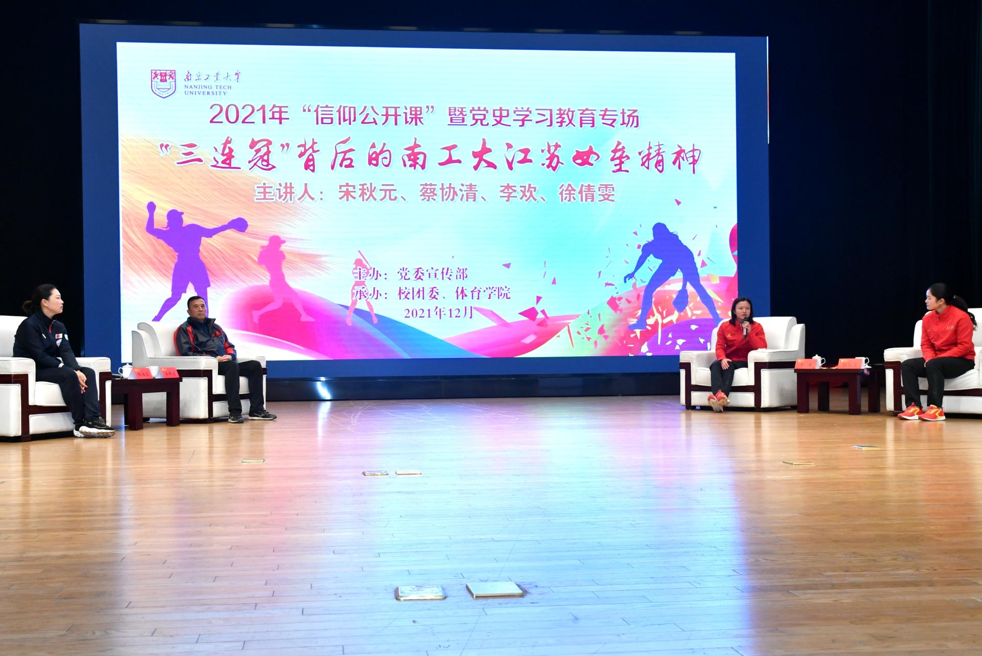 12月10日上午,2021年南京工业大学“信仰公开课”暨党史学习教育专场——“三连冠”背后的南工大江苏女垒精神在江浦校区博雅堂成功举办。南工大江苏女垒原主教练宋秋元,历任三位队长蔡协清、李欢、徐倩雯受邀作主讲授课。校党委副书记吴胜红、校党委常委、宣传部部长张健、校团委及体育学院领导出席了公开课。南工大江苏女垒队全体队员、体育学院在校全体本科生、各学院师生代表等近200人参加了现场公开课,上千名师生在线上直播平台同时进行了收听收看。