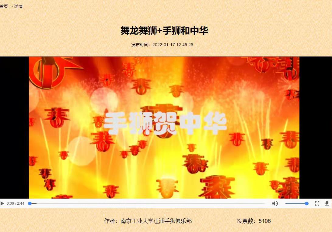 2月15日,从国家体育总局群众体育司公布的《2022年新春网络健身大联欢》活动成绩单中获悉,南京工业大学江浦手狮俱乐部作品《手狮贺中华》获得舞龙舞狮项目的一等奖。