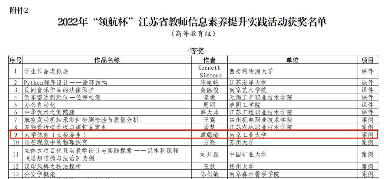 2022年“领航杯”江苏省教师信息素养提升实践活动已于近日圆满结束,江苏省教育厅办公室近日公示获奖名单,我院章璐璐老师的《大学体育(太极养生)》荣获信息化教学课程案例一等奖,也是我校唯一一项一等奖。