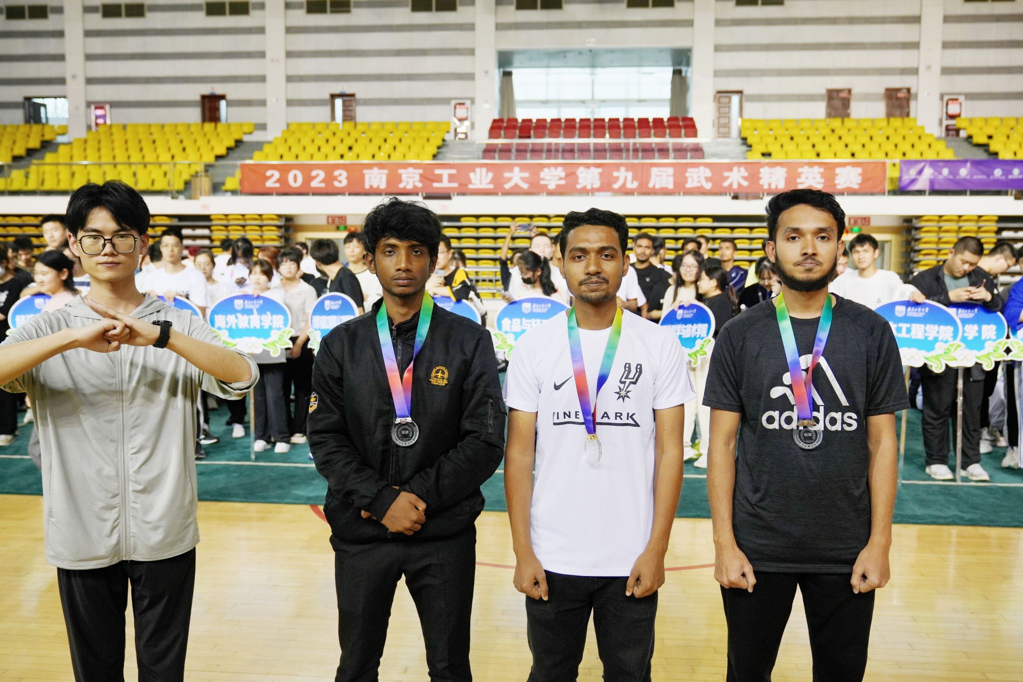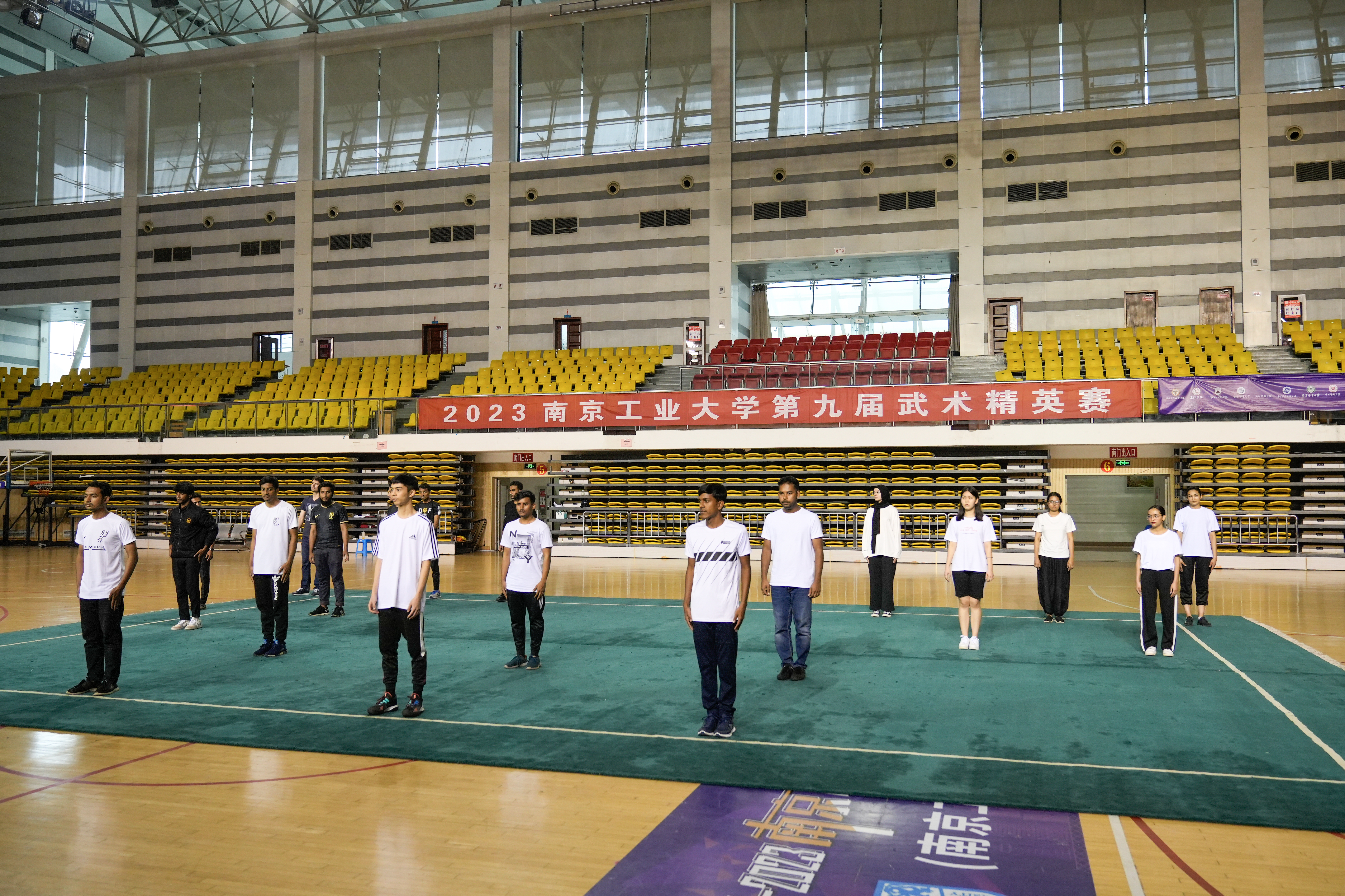 本次比赛由武术国家级裁判章璐璐老师担任总裁判长,国家一级武术裁判李佳静老师任裁判长,冯韬老师担任副裁判长,颜耀春、张海涛、胡琴、秦志华、严燕等老师担任裁判员,王小飞老师担任编排长,张文颂老师担任检录长。采用线上海选、线下决赛相结合模式。本次比赛分男女本科生组和留学生组别,由形意拳、南拳、二十四式太极拳、八极拳、八段锦、易筋经、传统短器械、传统长器械、各式太极剑、其它各式太极拳、各式太极剑、武术劲扇、集体拳术、集体八段锦、集体太极拳、集体武术劲扇等28个集体和个人项目组成。校舞龙队和江浦手狮俱乐部的同学进行了精彩的龙狮表演。