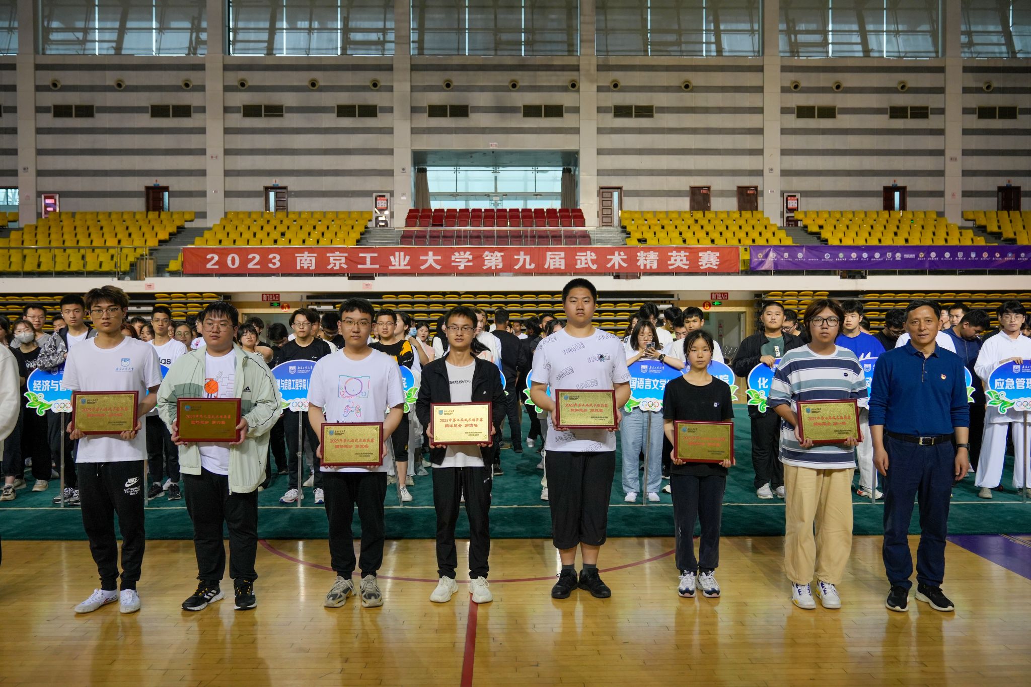 开幕式结束后,各参赛运动员陆续登场。运动员们信心十足,动作娴熟、一招一式或刚劲有力,或潇洒飘逸,个个身手不凡,充分展示了我校大学生“尚武崇德”的武术精神。居沈贵老师为团体前八名的代表队颁发奖匾。孙欣荣、章璐璐、李佳静、赵飞、冯韬等老师分别为本次比赛的前三名颁发奖牌。