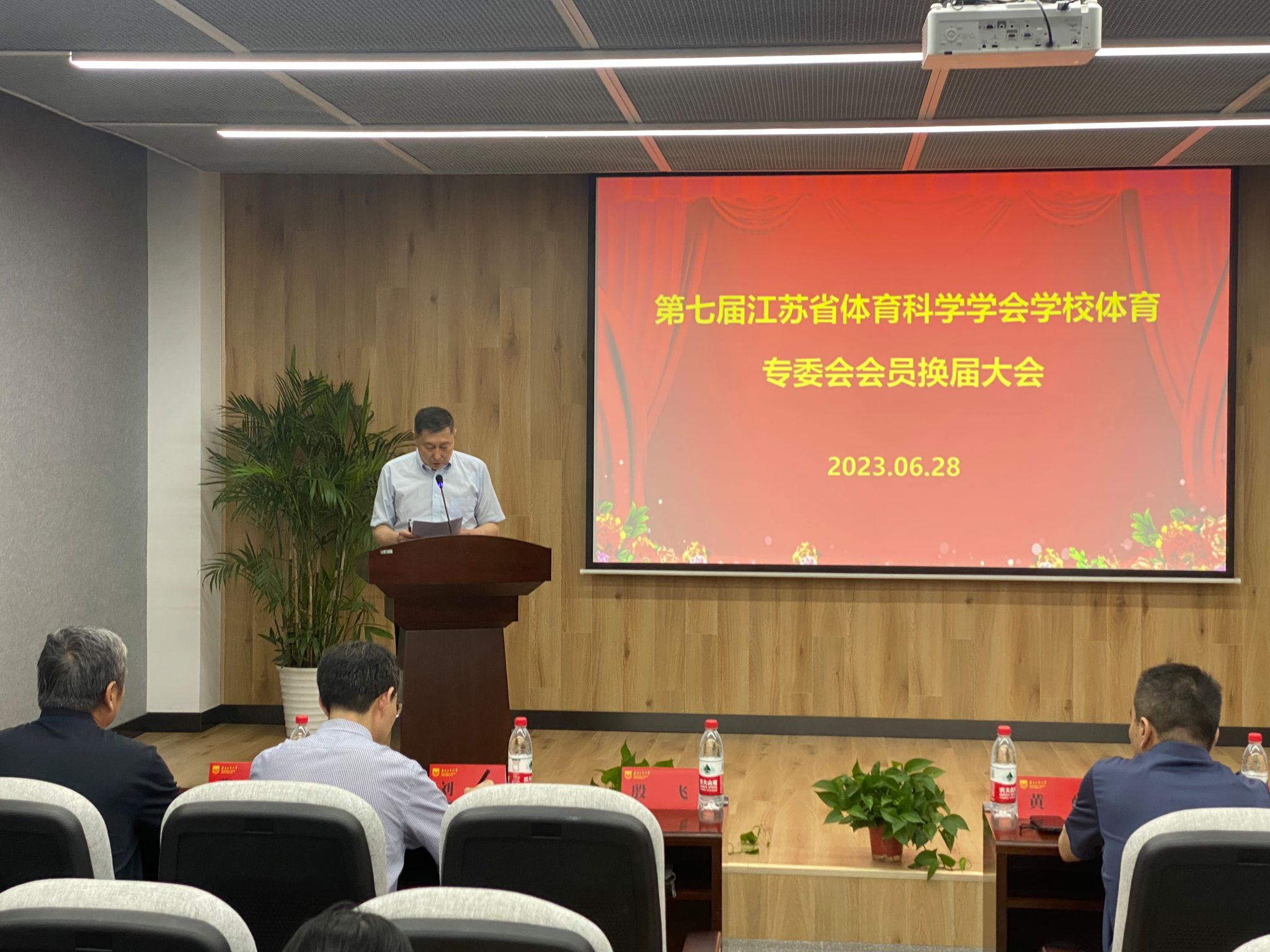 2023年6月28日,第七届江苏省体育科学学会学校体育专委会换届大会在南京工业大学顺利召开。江苏省体育科学学会副理事长兼秘书长黄峻、南京工业大学体育学院党总支书记刘涛、新一届学校体育专委会主任委员张天峰、副主任委员殷飞、金凯、张禾、刘军、杨浩等出席会议。会议由南京大学体育部主任殷飞主持。