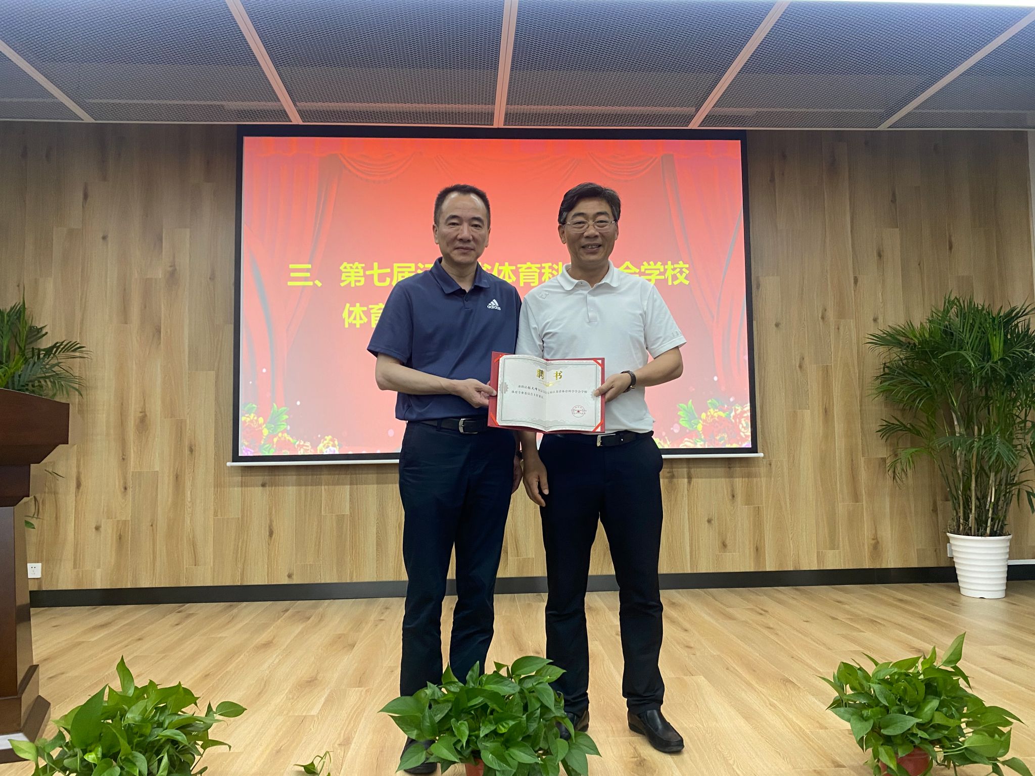 选举结束后,黄峻副理事长为学校体育专委会主任委员张天峰颁发聘书。张天峰主任为新一届的专委会副主任委员分别颁发聘书。