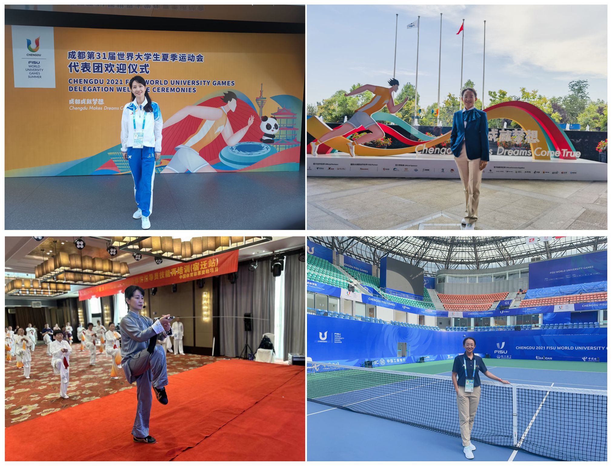 章璐璐、马俊驰两位老师赴成都参加了第31届世界大学生夏季运动会武术和网球项目的裁判工作。马俊驰老师还参加了2023年国际男子职业网球挑战赛张家港站裁判工作,担任裁判组长。章璐璐老师还参加了2023年全国大学生武术比赛、第四届全国老年人体育健身大会太极拳交流比赛执裁,江苏省武术队备战第一届全国(青年)运动会校园组比赛训练,2023年江苏省太极剑项目社会一级指导员培训教学、全国学校武术段位进课堂启动仪式等多项赛事服务与活动。