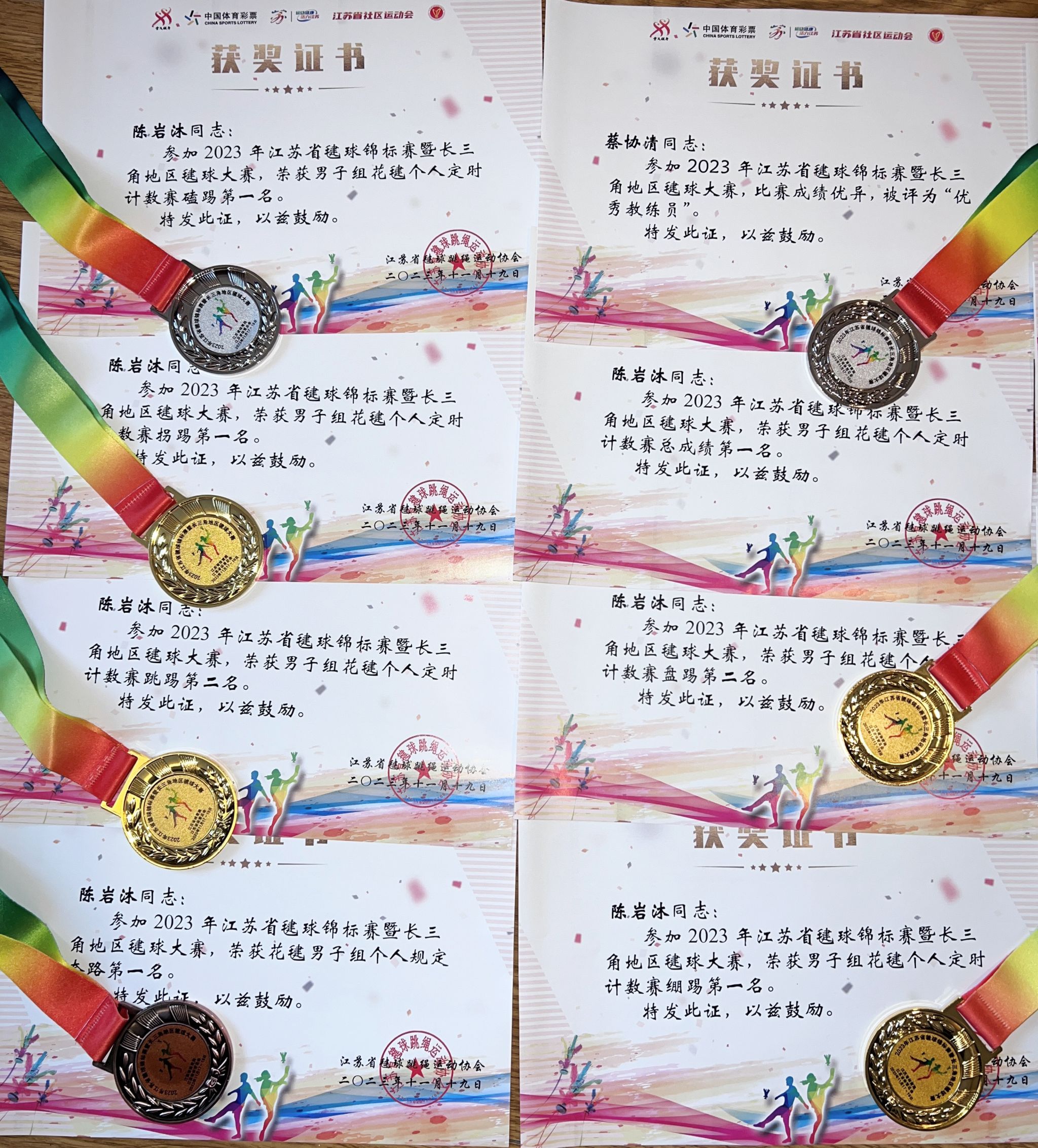 此后,在刚结束的2023年江苏省毽球锦标赛暨长三角地区毽球大赛中再次传来捷报,陈岩沐同学夺得男子组花毽项目磕踢、绷踢、拐踢、五项全能、个人规定套路共五枚金牌,盘踢、跳踢两枚银牌,再次为校夺得荣誉。
