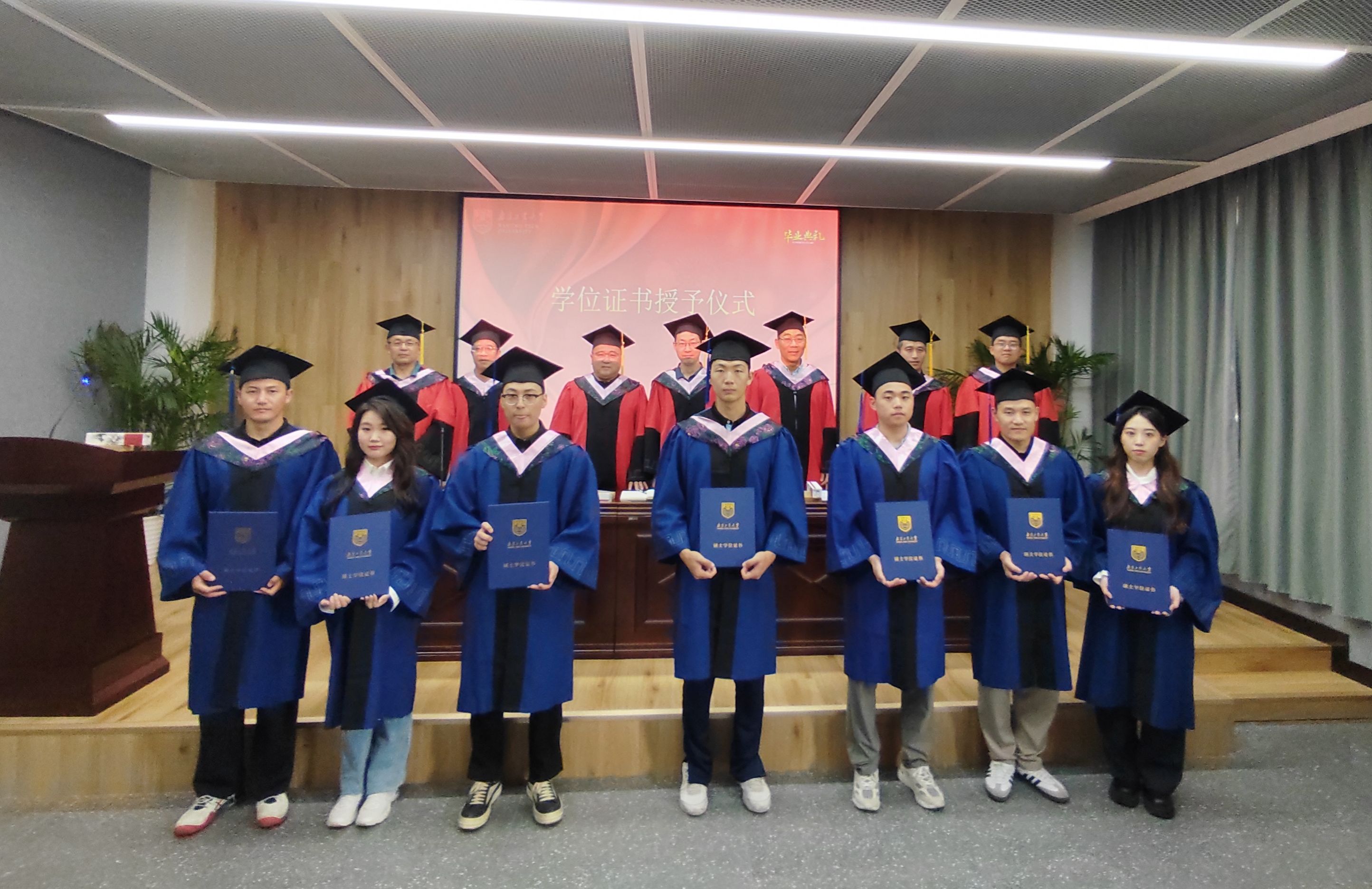 主席台就坐的领导和硕士生导师共同为硕士学位获得者代表援正流苏、颁发硕士学位证书并合影留念。