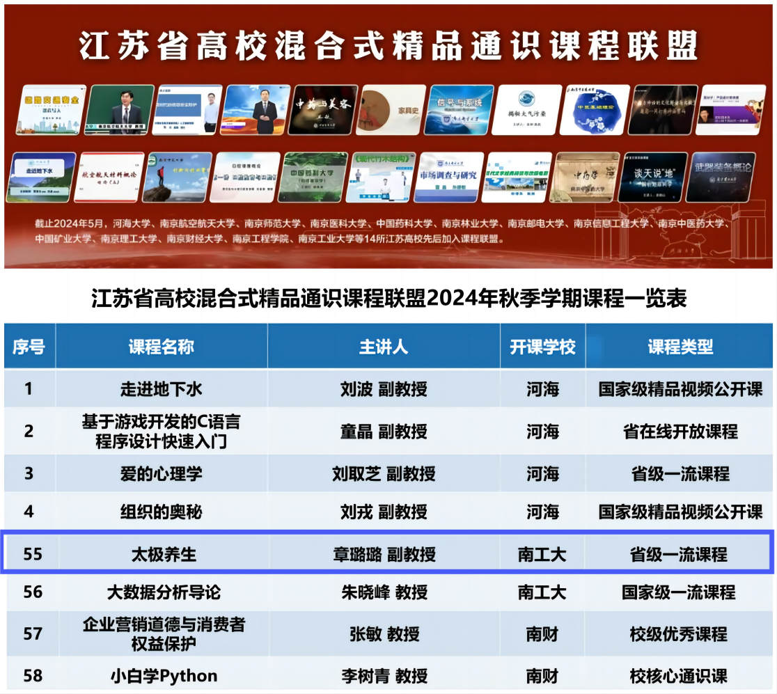 近日,我院章璐璐老师的《太极养生》课程成功入选江苏省高校混合式精品通识课程联盟2024年秋季学期课程名单,彰显了我院在课程建设和教学改革方面的努力和进步。