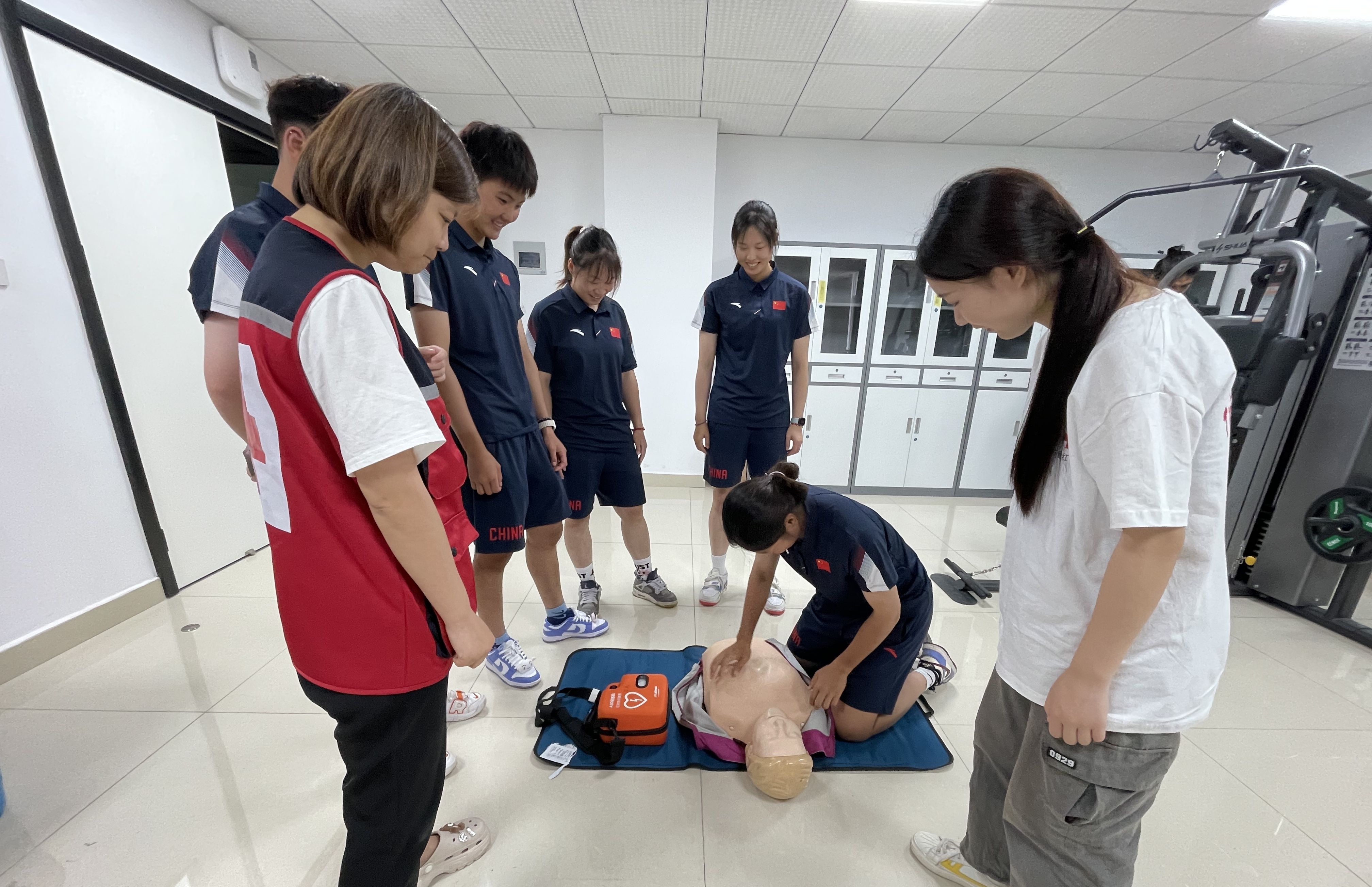 校医院丁春卉院长亲自授课,她以生动有趣的案例为切入点,深入浅出地讲解关于常见急症的现场紧急处理、现场心肺复苏、自动体外除颤器AED操作使用、创伤急救(扭伤、骨折)等基础且实用的应急救护内容。同时,通过模拟真实场景的实操演练,让运动员亲身体验急救操作的全过程,有效提升应急反应能力和实际操作水平。