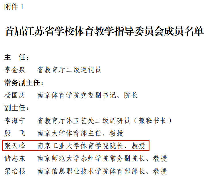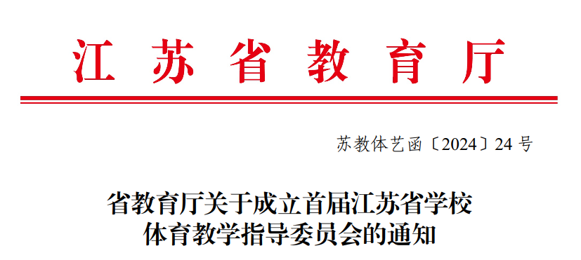 近日,江苏省教育厅下发了《省教育厅关于成立首届江苏省学校体育教学指导委员会的通知》(苏教艺体涵〔2024〕24 号),我院张天峰教授当选为首届江苏省学校体育教学指导委员会副主任委员,任期5年,自2024年8月起至2029年8月止。