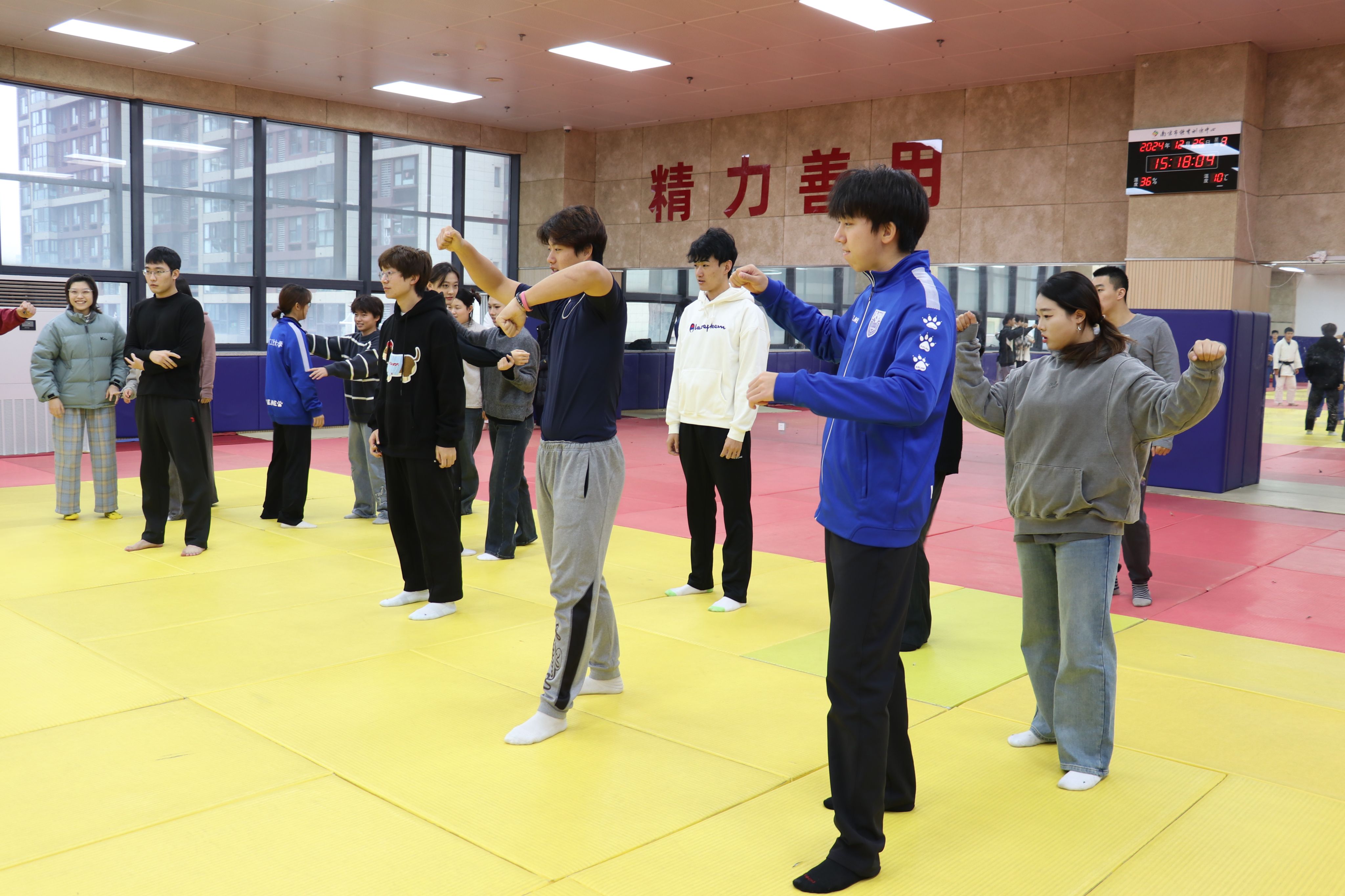 随后,戎主任带领师生参观了南京市体育训练中心训练楼,观摩了女子柔道队的训练,参观了训练中心配备的先进医疗设备。在男子柔道队的训练场,师生们近距离感受了运动员们训练的场景和氛围,柔道教练指导大家体验了大外刈、背负投等基础动作。同学们们积极参与,乐在其中,对柔道运动的艰辛与魅力有了全新的认识。