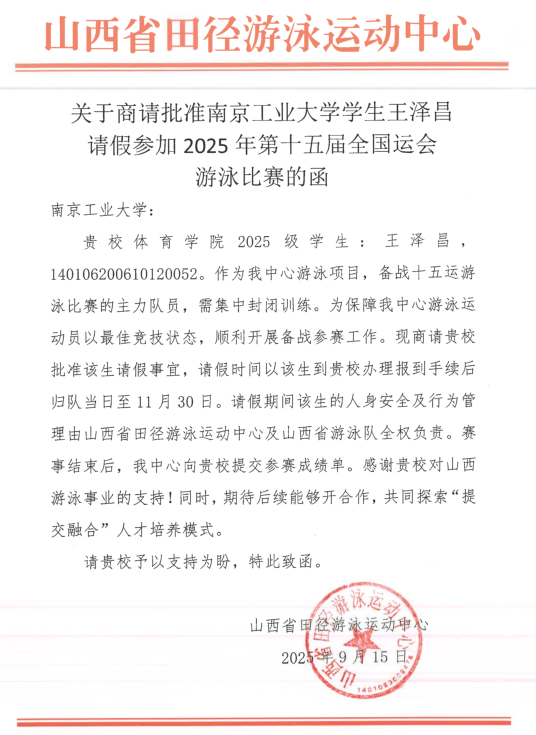 与此同时,运动2502班的王泽昌也是匆匆赶来报到以后,就马不停蹄地赶赴山西游泳集训基地。这位太原市体育运动学校走出的小将,将代表山西参加第十五届全运会游泳赛事,其请假期间的训练表现将由山西省田径游泳运动中心同步反馈学校,纳入综合素质评价。这种“赛事—学业”双跟踪模式,正是体教融合的精准诠释。