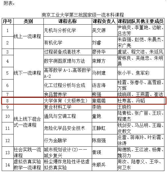 近日,教育部公布第三批国家级一流本科课程认定结果(教高函〔2025〕9号),我院章璐璐老师作为课程负责人,联合杜寿高、冯韬老师建设的《大学体育(太极养生)》课程成功入选国家级线上线下混合式一流本科课程,实现我院国家级一流课程“零”的突破。