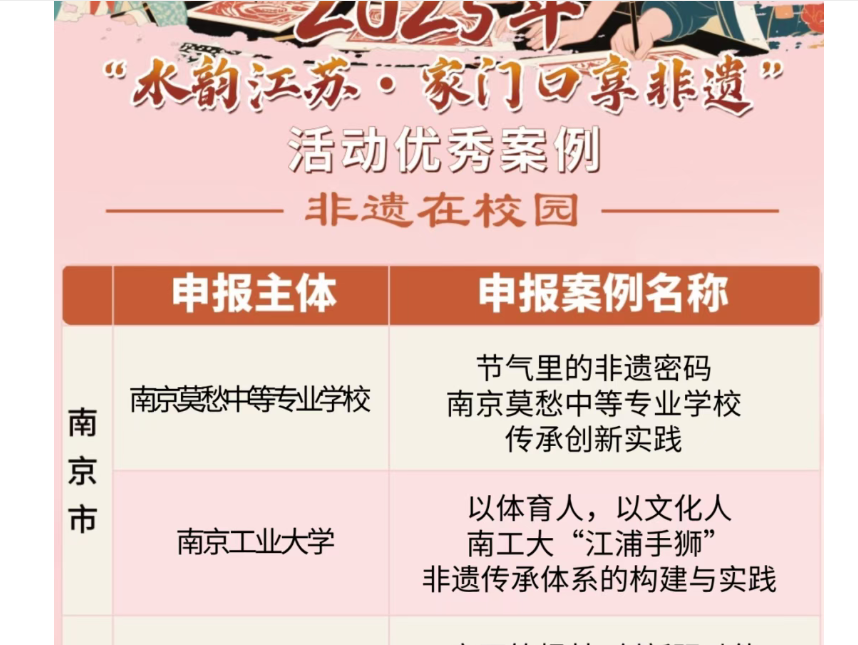 “水韵江苏·家门口享非遗”活动由江苏省文化和旅游厅于今年2月启动,分别有“非遗在社区”“非遗在乡村”“非遗在校园”三类,其中“非遗在校园”有27个案例获奖,高校只有南京工业大学、东南大学、江苏海洋大学、中国矿业大学四所学校获得优秀案例。