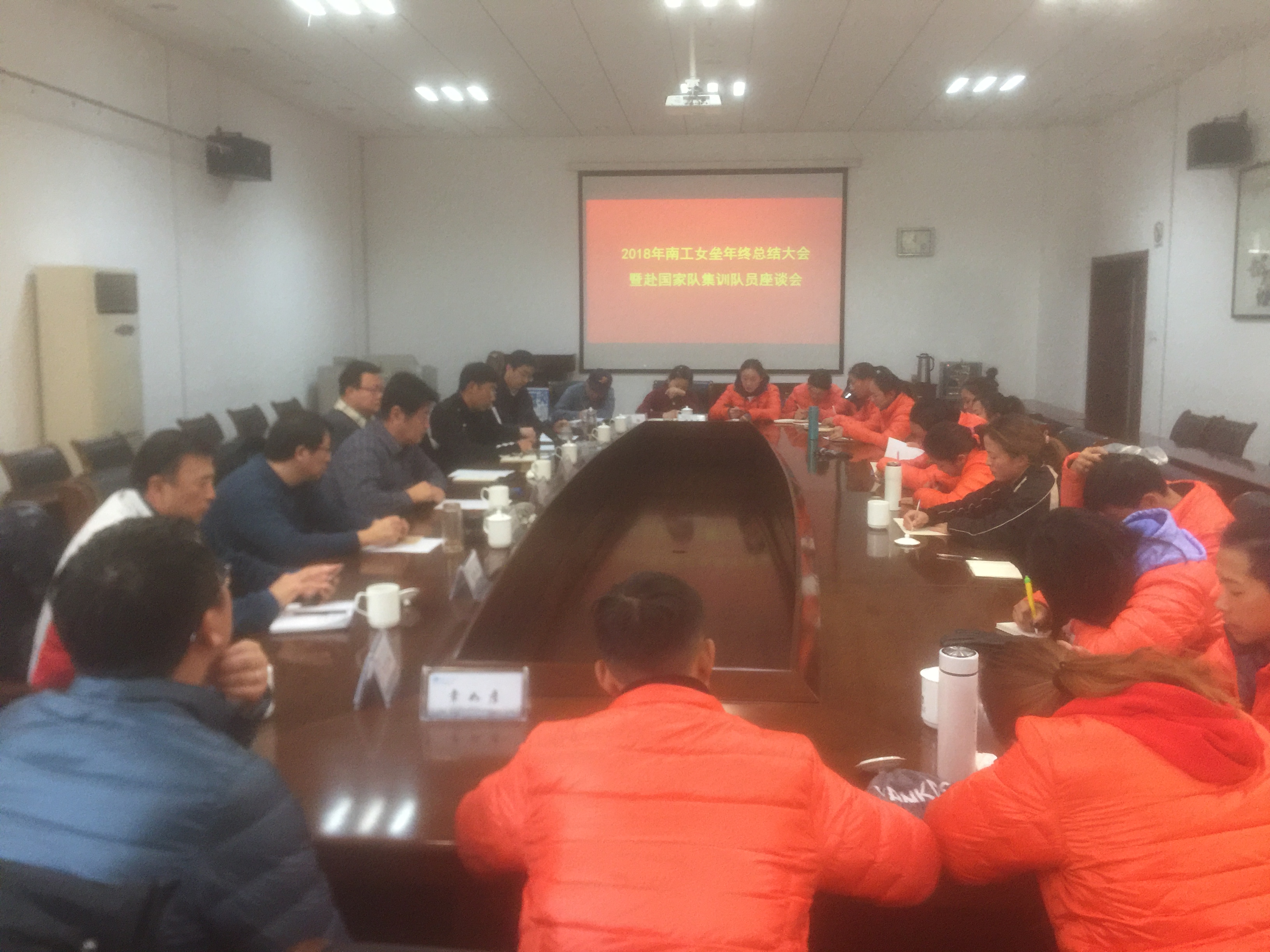 2018年12月29号上午,在南京工业大学浦口校区体育馆会议室召开了2018年江苏女垒年终总结会暨赴国家队集训队员座谈会。参加会议的领导有:南京工业大学副校长赵志宏、江苏省体育局竞技体育处调研员、省体育局手曲棒垒球运动管理中心主任严小平、江苏省体育局手曲棒垒球运动管理中心副主任石文虎、南京工业大学体育部主任张天峰、南京工业大学体育部党总支书记方建强、江苏女子垒球队总教练宋秋元,出席会议的还有江苏女子垒球队教练组成员、全体运动员及训练管理干部。会议由张天峰主任主持。