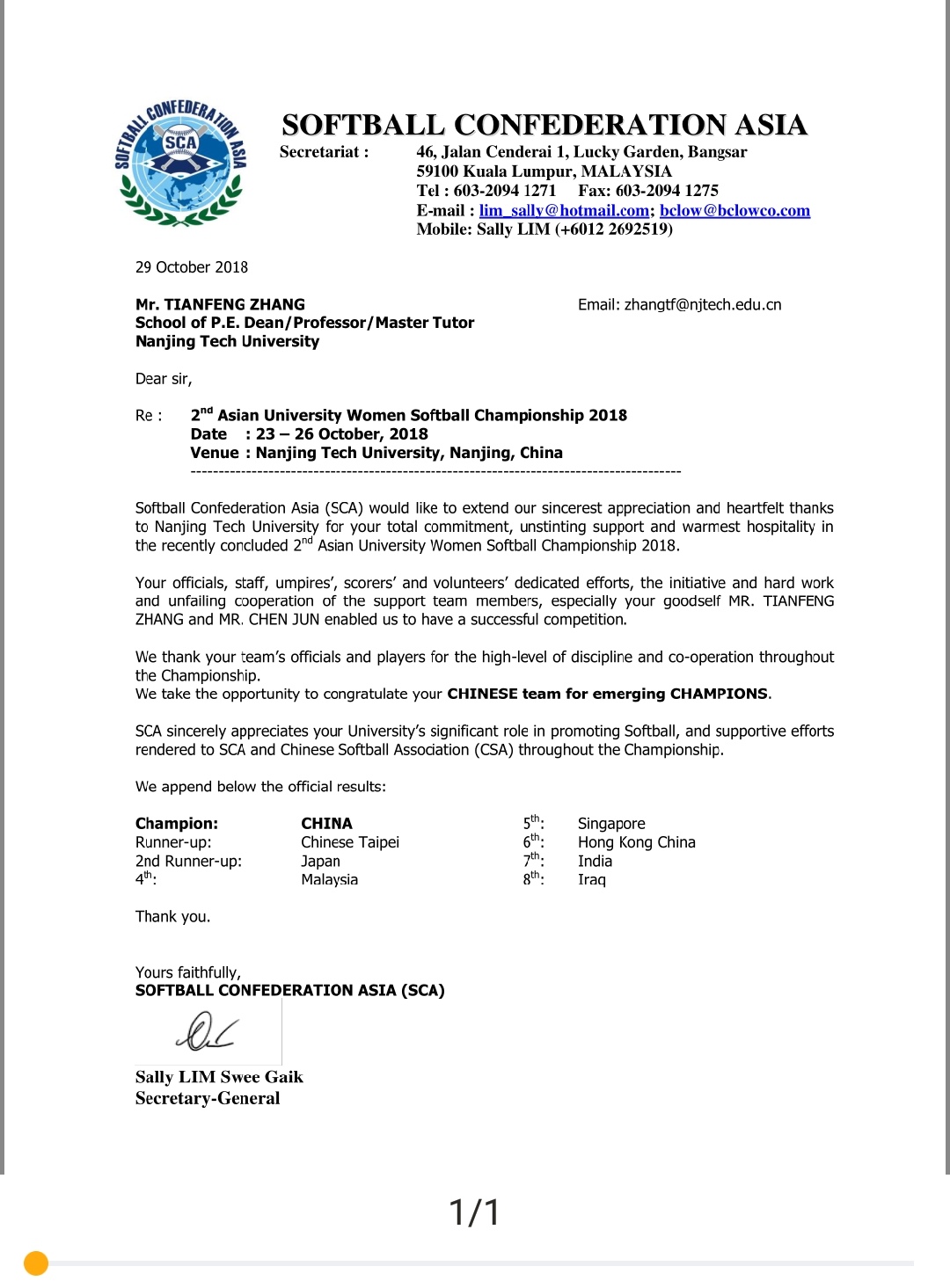 近日,亚洲垒球联合会(SCA)向我校发来感谢信,感谢学校在刚落幕的2018年第二届亚洲大学生女子垒球锦标赛中为大会提供的热情周到的服务。正是因为学校的领导、工作人员、裁判员、记分员和志愿者们通力合作、不懈努力和辛勤付出,为全体参赛队员们提供了全方位的保障和优质服务,让此次大赛取得圆满成功。