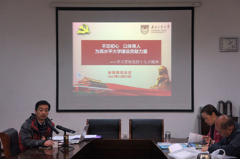 11月22日下午,体育部党总支在体育馆VIP3会议室召开全体党员会议,专题学习贯彻党的十九大精神。