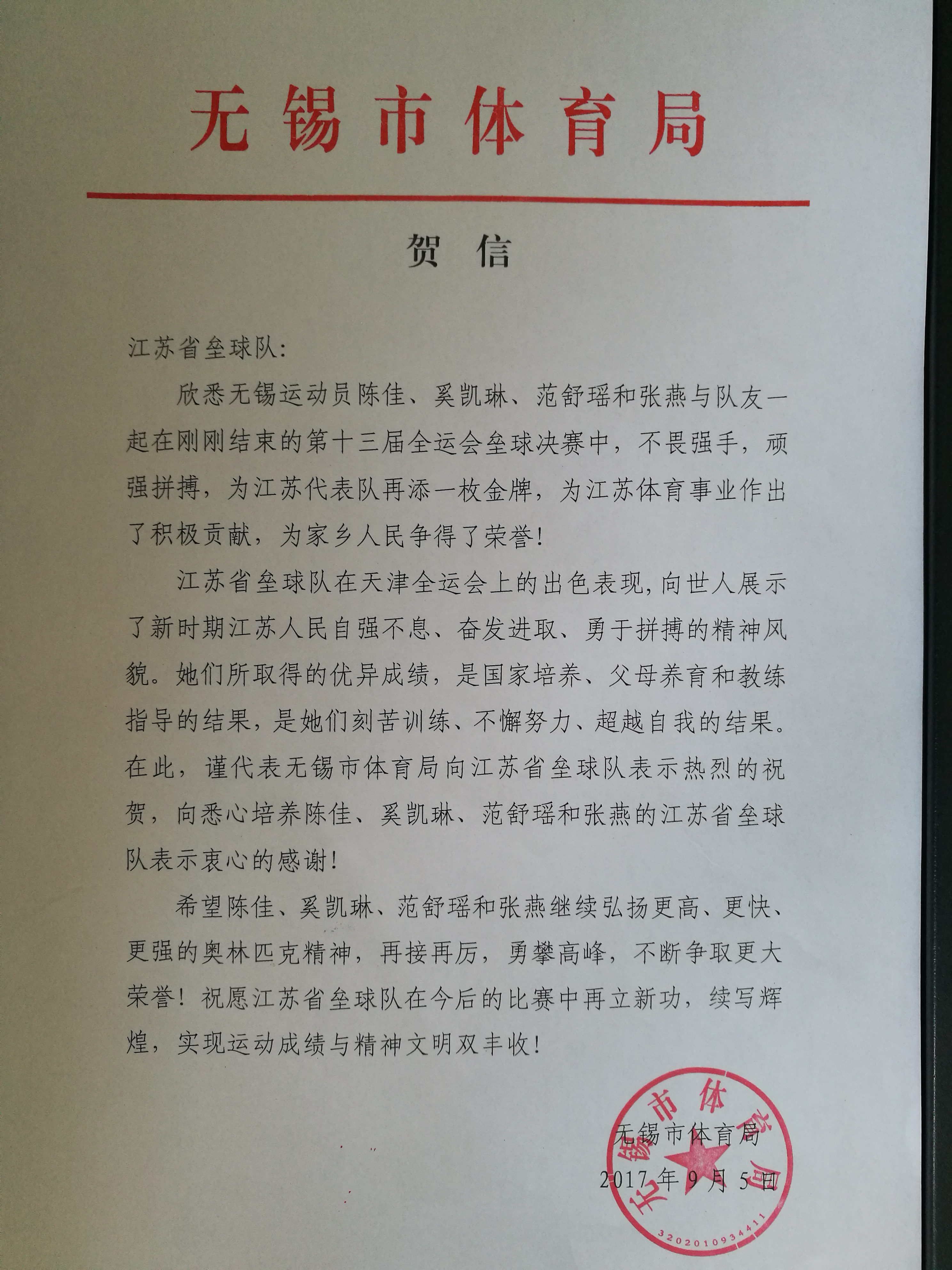 无锡市体育局在贺信中对江苏女垒在全运会上表现出的自强不息、奋发进取、勇于拼搏的精神风貌表示赞扬,对悉心培养了陈佳、奚凯琳、范舒瑶和张燕四名无锡运动员的江苏省垒球队表示了衷心的感谢。
