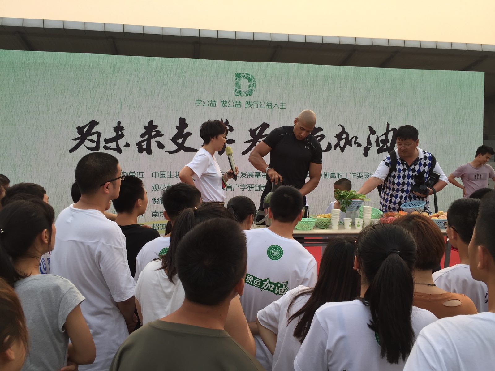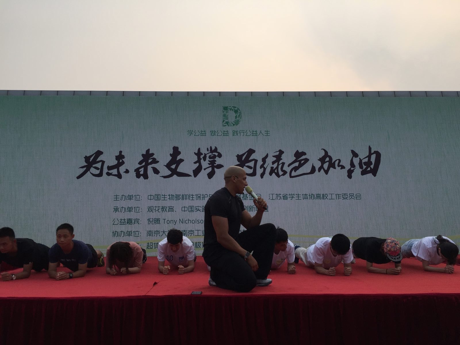 由中国生物多样性与绿色发展基金会(以下简称”中国绿发会”)和江苏省学生体协高校工作委员会共同主办的“为未来支撑、为绿色加油”中国大学生公益活动6月2号下午在南京大学举行。此项公益活动旨在让更多的大学生了解健康和健身的关系,帮助更多的大学生开启健康生活模式。活动邀请了被誉为中国顶级教练、中国最具人气的健康生活顾问、知名健身专家的Tony Nickolson(中文名:倪腾),现场为大学生指导如何正确地进行体能训练。来自南京大学、东南大学、南京师范大学、南京邮电大学、南京财经大学、南京工业大学等多所高校的数百名大学生参加了此次活动。