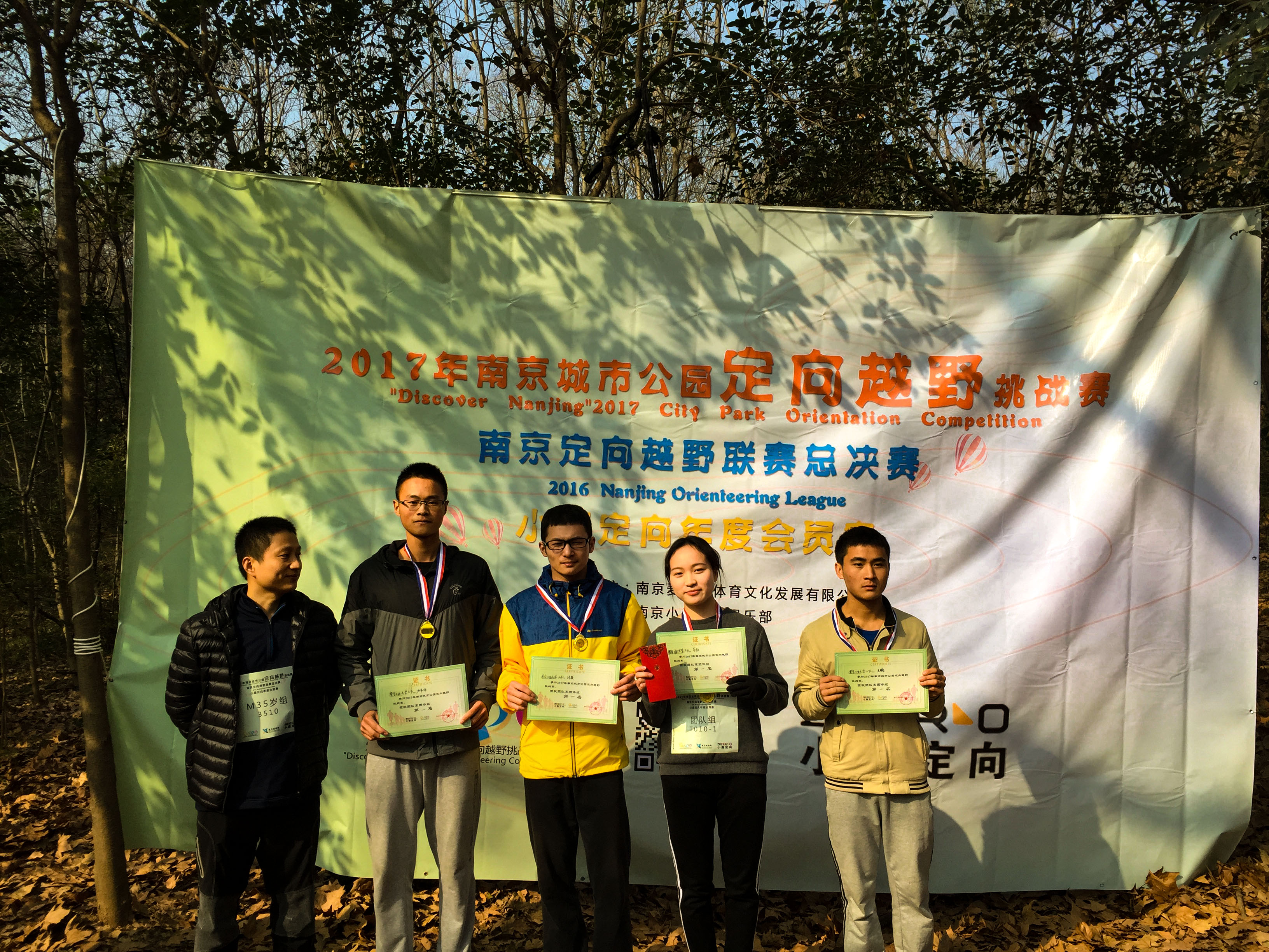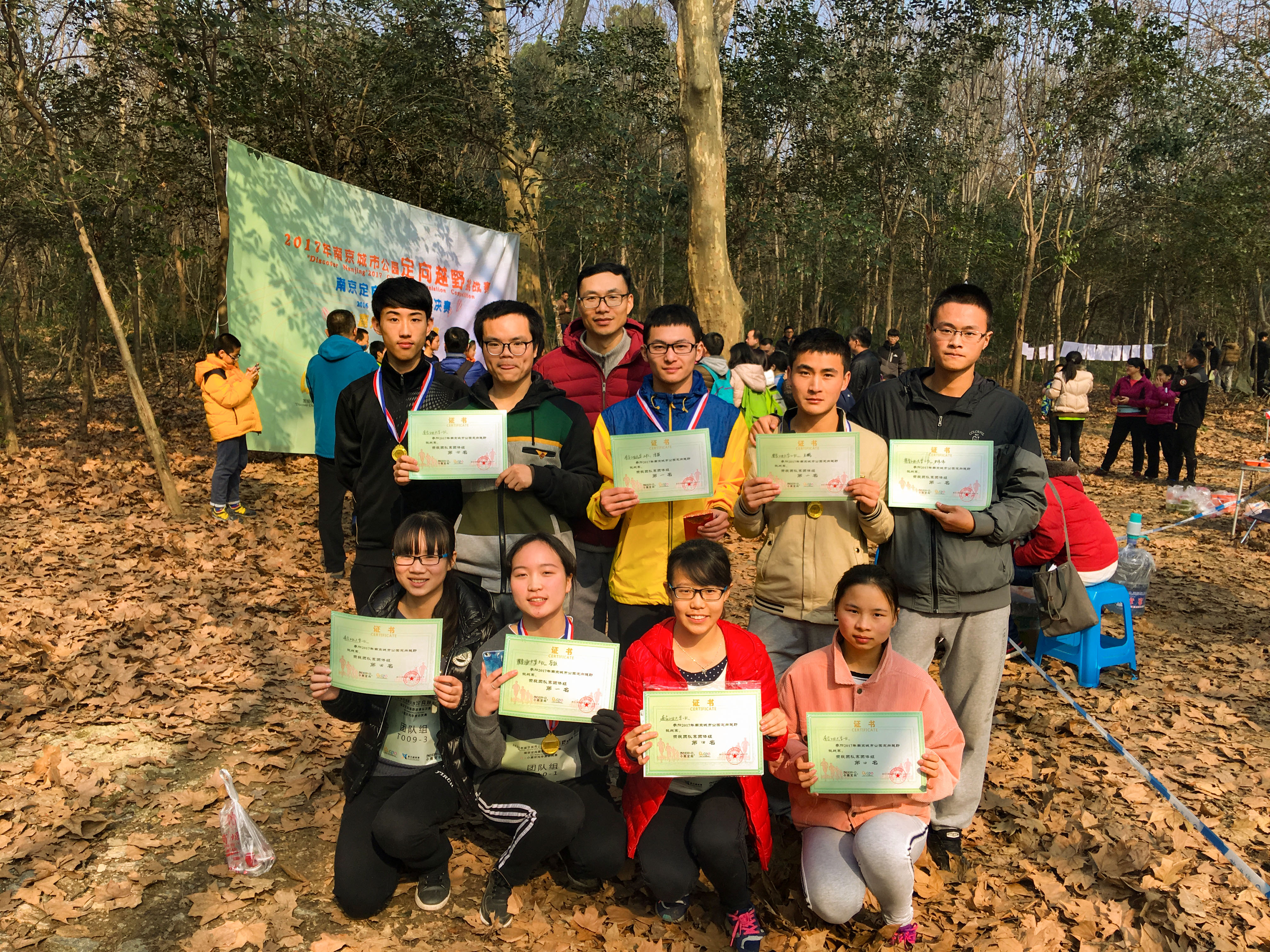 2017年新年第一天清晨,南京工业大学定向越野队9名队员,放弃元旦假日休息,早早来到地铁站,长途跋涉来到南京中山陵东郊野外参加本次比赛。此次比赛场地是完全陌生的野外山林环境,地形复杂、山路崎岖、荆棘丛生、碎石嶙峋、地面湿滑,对我们新队员来说是一次严峻的考验。但我们的队员不畏艰难,顽强拼搏,由电气1603班的王伟伟、新能源1601班的王鹏、过装1503班的张颖和土木1507班的蔡颖组成的二队获得本次团队赛冠军,由生工1502班的吴青阳、制药1503班刘婷、环能1501班任可欣和2011学院的龙太旺组成的一队以2秒的微弱劣势获得第四名。