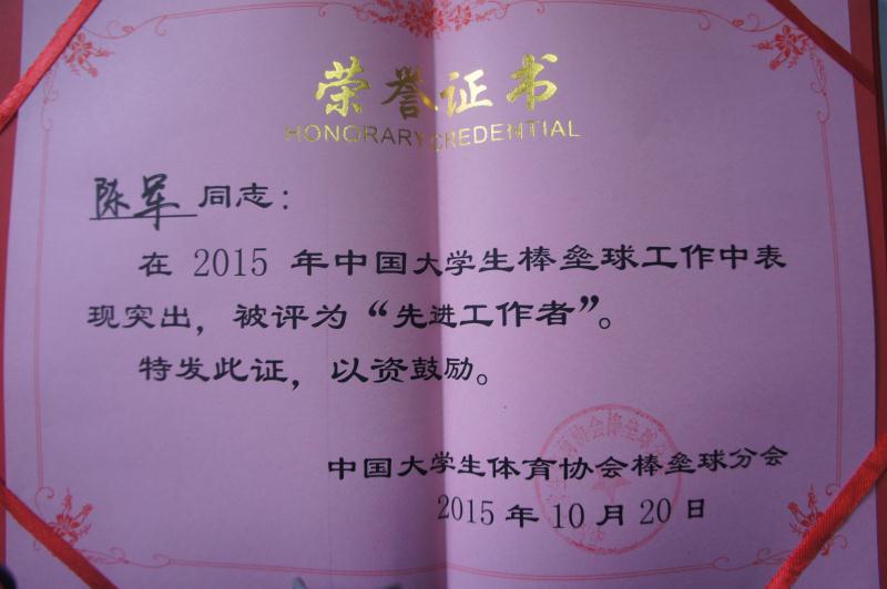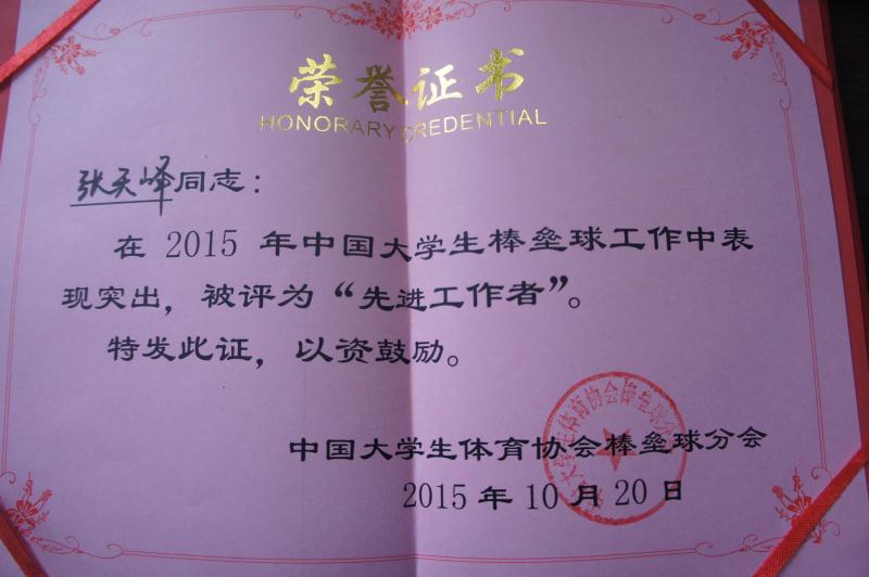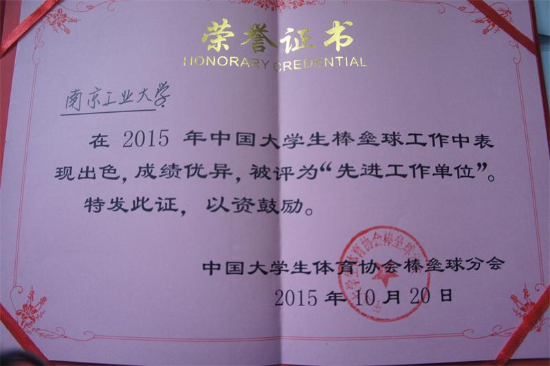 2015年12月9日,中国大学生棒垒球体育协会分会年会在深圳举行,会议对分会的2015年度工作进行总结,讨论和商议了2016年工作计划,并对在2015年度协会工作中表现出色单位及个人进行表彰。南京工业大学被授予“先进工作单位”,同时张天峰同志,陈军同志被评为“先进工作者”。