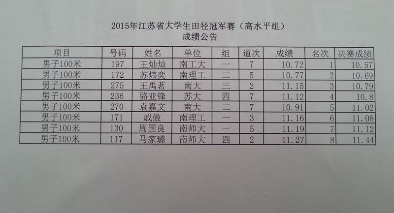 2015年江苏省大学生田径冠军赛中我校运动员王灿灿获得男子百米冠军,跑出10.57秒的优异成绩。王灿灿同学为我校经管学院工程管理专业大二学生,在於鹏老师的指导下,经过一年半时间的不断训练,王灿灿同学在专项体能和核心技术上取得初步成效,在起跑与途中跑的连接以及全程节奏的掌控上取得突破性进展。本次比赛在赛前心态调控和全身心投入比赛上做得较好,虽然冒着寒雨,依然跑出优异成绩。王灿灿同学是我校继王胜亚同学之后培养出的又一个百米跑出10.50左右的运动员,该队员在比赛经验和技术细节上还有一些改进之处,具有很大提升空间。另外我校孔景同学在男子铁饼项目中勇夺第一,投出46.70米的好成绩,希望2名队员再接再厉,争取参加下届大运会!