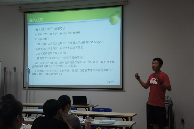 29日上午10:00理论课:垒球规则讲解,由国际级裁判张健负责,学员们认真听课,并做了相关笔记。下午2:30由国家级裁判陈军、解鑫讲解临场实战,包括裁判员宣报、手势以及司球裁判判球。晚上7:00进行了判例讲解及辅导。