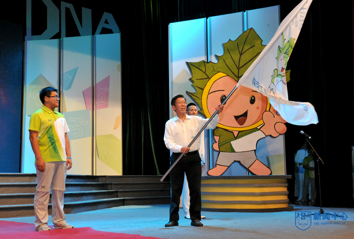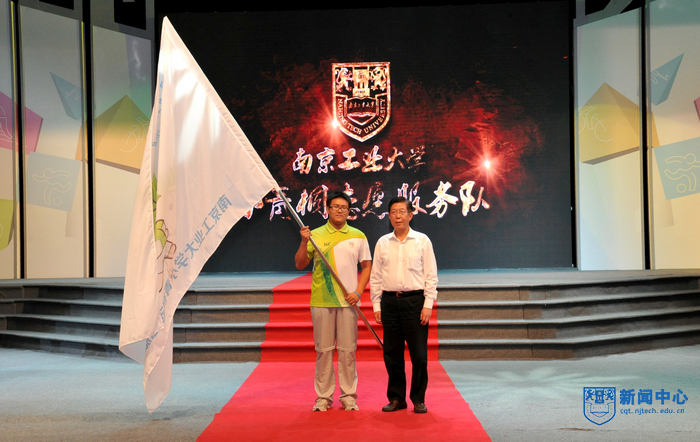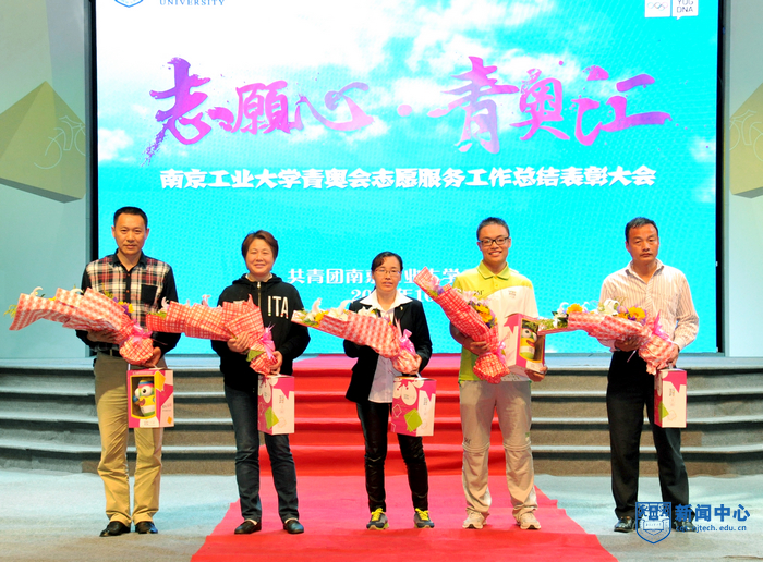 大会先后表彰了最美志愿者、感动青奥人物、宣传文化之星、明星志愿者和志愿服务优秀团队,与会领导和嘉宾分别为受表彰的先进个人和集体表彰。食堂阿姨、保安大叔、校车司机、宿管阿姨等一批服务志愿者的特殊“志愿者”也应邀来到表彰大会现场,一段记录学校后勤工作人员暑期参与志愿服务校内保障的视频再现了他们的辛劳和付出,志愿者代表为他们献上鲜花和青奥吉祥物砳砳,现场掌声雷动。今年夏天,我校青奥会志愿者们有了自己的昵称——小青桐,寓意青春朝气、坚守岗位。为进一步传承青奥会志愿服务精神,营造良好的志愿活动氛围,校团委决定成立“南京工业大学小青桐志愿服务队”,并将其打造成一支特色鲜明、服务精准的志愿者队伍,未来为校内外体育赛事和教学提供专业性较强的志愿服务,王德明书记欣然为小青桐志愿服务队授旗。