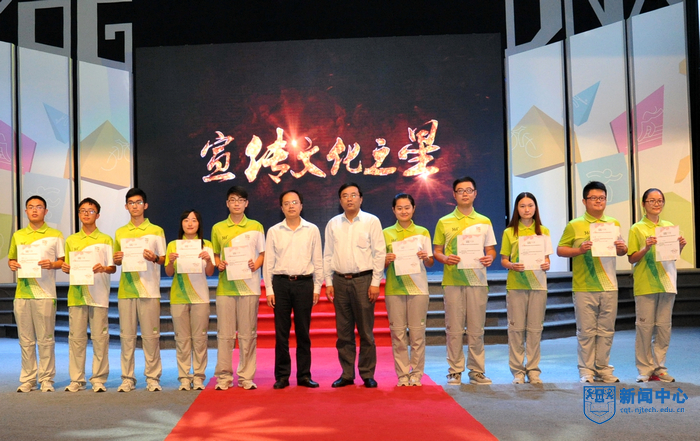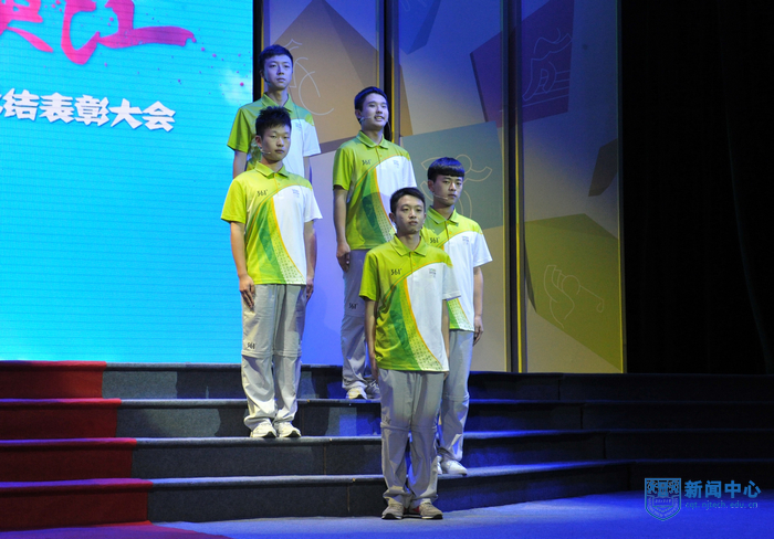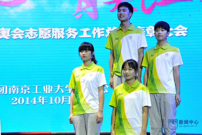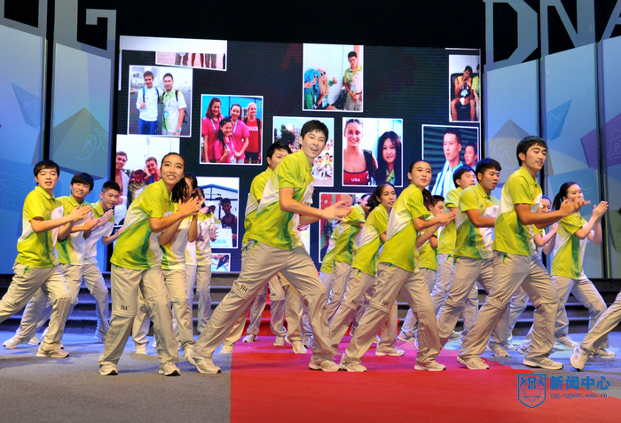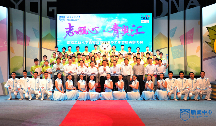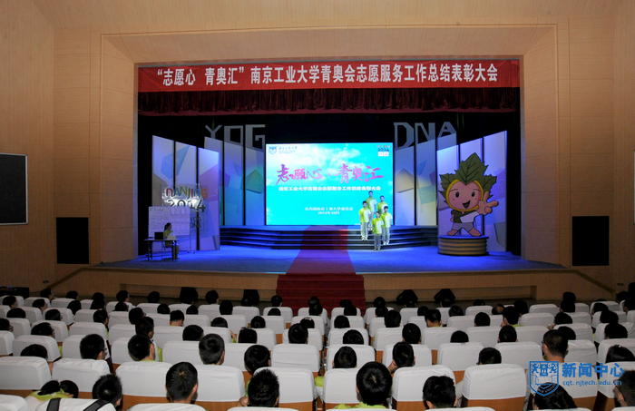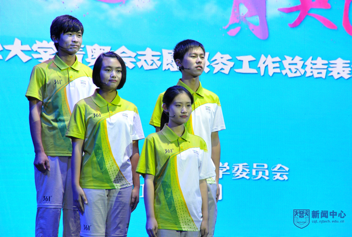 “南京工业大学的青年志愿者朋友们,你们的辛勤付出将永远镌刻在青奥会的光辉历史上”,表彰大会在青奥会开闭幕式总导演陈维亚的寄语视频中拉开帷幕。表彰大会上,校团委精心拍摄的视频将全场观众带回了热情似火的青奥历程,身穿青花瓷礼服的礼仪旗手志愿者、日夜坚守的停车场助理、手握沙耙的平沙员、接洽运动员最频繁的数字媒体中心助理、哪里有外国友人哪里就有翻译服务的语言志愿者,他们工作的场景一一再现,全场观众沉浸在一幕幕充满智慧、充满勇气、充满激情的志愿服务故事中。“这个夏天,我说的最多的是‘hello’,而我听到的最多的却是‘你好’”、“这个夏天,我不能回家了,半年没有见到爸爸妈妈,我很想你们。今年夏天,我们都是志愿者”…志愿者代表表演的朗诵《这个夏天》感人至深。由志愿者表演的两段舞蹈《Here we go》和《all for one》动感十足,充满青春的激情。志愿者自编自导自演的小品《村里那些事》将青奥村访客中心志愿者如何解决泰国访客遭遇语言服务难题的趣事表演得诙谐幽默。