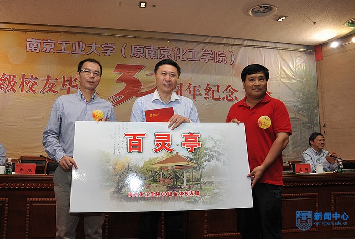 会上,校友叶灿雄和赵华代表全体80级校友向母校捐赠“百灵亭”,副校长乔旭代表学校接受捐赠并向校友代表颁发了捐赠证书。
