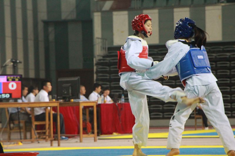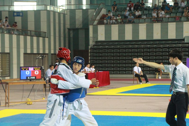 7月8日的比赛,我校男子组65公斤级选手朱昊和女子组47公斤及以下级选手黎娜参加了比赛。朱昊所在级别的选手人高马大,且出腿速度快,力量足,是竞争最激烈的一个组。朱昊不惧对手,积极进攻,打出了气势,由于对手太强,最终止步第一轮。黎娜选手进攻凶狠,柔韧性和力量在同组选手中都有很大优势,比赛中频繁击中对手头部,轻松的晋级。在接下来的比赛中,由于她体力消耗比较大,没有打出正常水平,遗憾获得第五名。