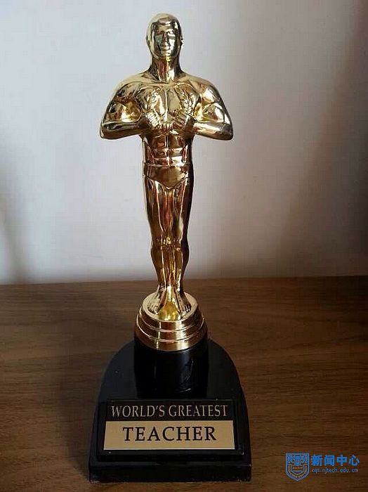 今天(6月12日)上课得到了个惊喜! 刚一进教室,全班(英1101)同学竟然给我颁发了一个他们自己准备的“最佳教师奖”奖杯!闪闪发光的小金人,很有奥斯卡的感觉。班长还代表大家致颁奖词,全班响起真挚的掌声,我一时感动的无语……谢谢学生们的肯定和感恩,这也是对我继续努力的鼓励!虽然任教以来,我也算获奖无数,但这个由学生自发颁的奖是对我的付出最大的肯定,是最为珍贵的礼物!