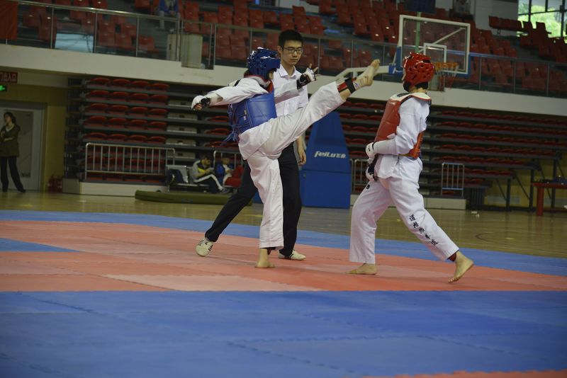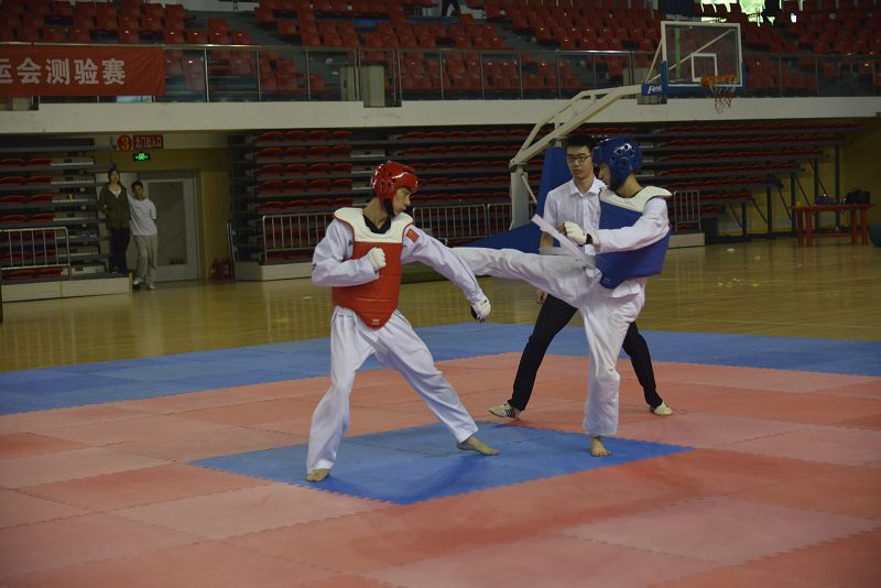 比赛的第二大项就是跆拳道竞技比赛,跆拳道竞技对抗性较强,对竞技技术和运动员的心理素质要求都较高。此次竞技比赛既是省运会前热身,又是对参赛运动员的一种历练。首先男子65公斤级比赛,青方运动员史浚男,红方运动员朱昊。比赛开始,双方运动员立即进入比赛状态。进攻,反击,双方运动员你来我往打的不可开交,难解难分。随着比赛的进行,运动员体力都有些消耗,青方运动员抓住一个机会,踢头得到三分,观众报以热烈掌声。尽管红方运动员也进行了反击,但还是遗憾落败。第二场是女子52公斤级比赛,红方运动员徐泉玉,青方运动员颜露婷。比赛开始,红方利用自己柔韧性好的优势,连续攻击对手头部,但几次攻击都被青方有效地防了下来。尽管是女子比赛,而且是轻量级的,激烈程度不亚于男子比赛。她们敢打敢拼,给观众留下了很深印象,最终,红方运动员依靠自己柔韧性好的优势获胜。最后是男子70公斤级比赛,红方运动员谢世浩,青方运动员迟杨。比赛开始,双方就展开了对攻,你来我往十分的激烈。对抗也伴随着疼痛,比赛中红方选手脚稍有不适,但经过简单处理还是回到场上。最终,青方以微弱的优势战胜了红方。跆拳道竞技展示了运动员正面对抗,敢打敢拼精神,比赛有输赢,他们拼搏的精神都值得我们尊重。