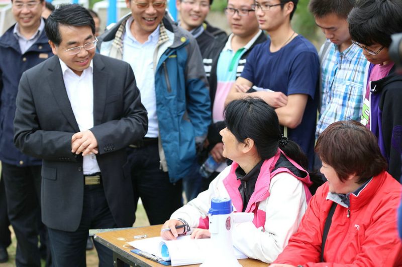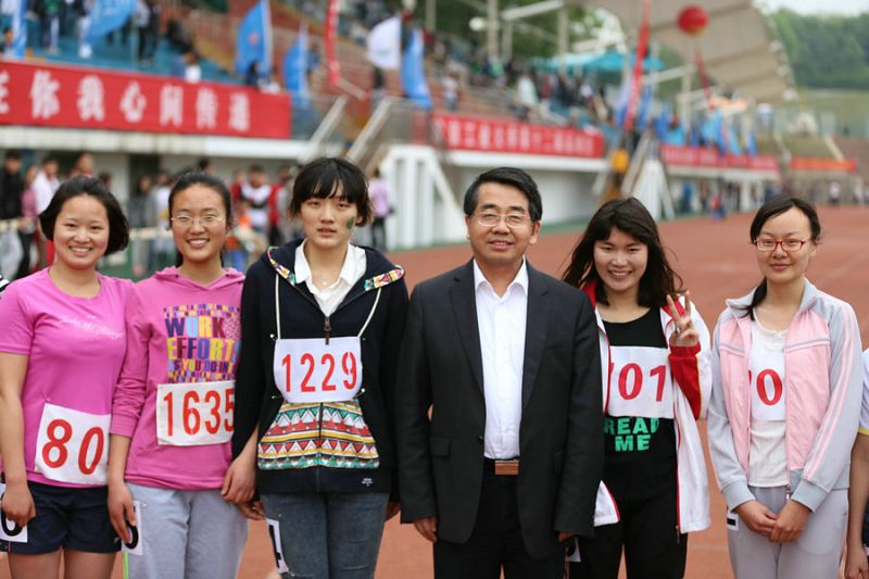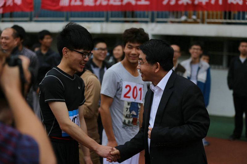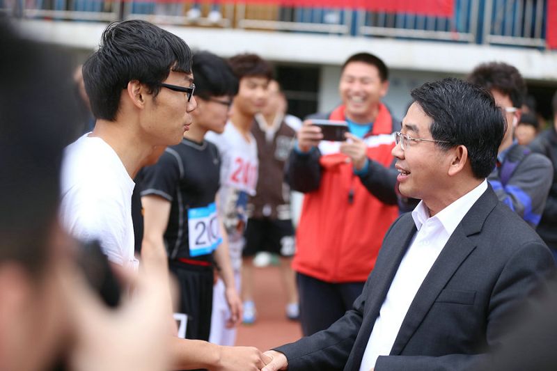 4月25日下午一点二十分,校长黄维院士在校长助理兼校办主任何学军陪同下,亲临校运动会赛场,观看比赛,当观看了学生男子100米和女子100米的决赛后,热情地与运动员一一握手表示祝贺和感谢,随后和大家合影留念,满足学生的迫切心情,运动员们被和蔼可亲的黄校长能在百忙中亲自前来观看校运动会比赛,无不欢欣鼓舞。黄校长看完了学生100米决赛后,又来到田径场东南铅球区观看学生铅球比赛,看到学生投出了一个很好成绩,连声说:“好好好,应该是冠军了”。还亲切地询问那位学生是哪学院?学的是什么专业?当得知是土木学院的一名普通学生时,称赞其身体真棒,希望他继续保持好身体,坚持体育锻炼,参与体育比赛。黄校长看到体育教师在专心裁判的情形,主动前去向裁判们问候,“谢谢大家!大家辛苦了!”
