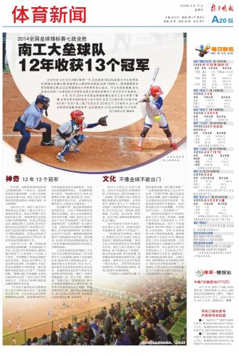4月15日,2014年全国垒球锦标赛在南京工业大学落下帷幕,全学生军出战的南京工业大学队,先后7:0胜天津,7:0胜河南,9:0胜广东,6:1胜上海,7:0胜北京,3:0胜辽宁,7:2胜四川,以七战全胜优异成绩,荣获冠军,这也是她们12年以来的第13个冠军。