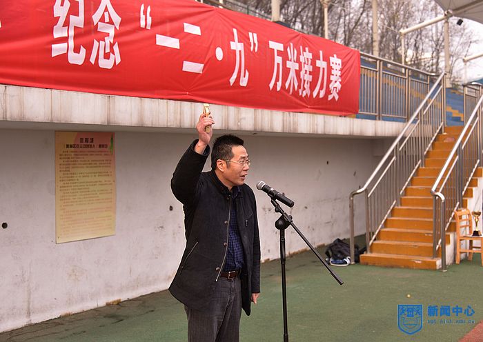 校学生工作处处长郭万牛发令,举行了第十三届“星火杯”纪念“一二·九”万米接力赛。