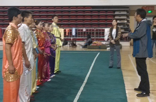 测验当天,队员们早早地来到了体育馆,开始热身做准备活动。所有队员都把这次测验当作正规的比赛来对待,一切按比赛要求进行,服装,器械,化妆等都确保到位。下午四点钟,测验准时开始,队员按照抽签顺序依次上场。他们展示的有:舒展大方的长拳;刚柔相济的太极;灵活多变的剑术;刚劲勇猛的刀术;枪术枪扎一线,工于一圈;棍术梢把并用,长短兼施。精彩的演示赢得了老师和同学们的阵阵掌声和助威声。
