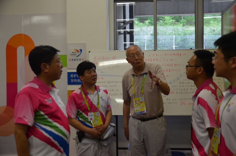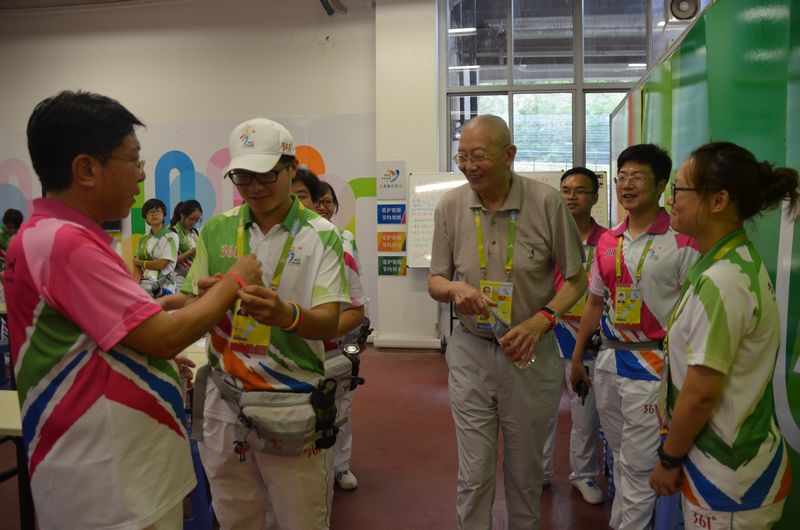8月13日,亚青会迎来第一场比赛日,整装待发的志愿者们以高昂的热情投入到全天比赛服务中。在比赛如火如荼进行期间,亚奥理事会名誉副主席魏纪中先生、亚青会南京工业大学体育馆场馆团队执行主任、南京工业大学党委书记王德明教授在志愿者的陪同下来到赛场,观看了中国队对伊拉克队比赛。比赛间隙,魏主席饶有兴趣地了解了志愿服务的相关运行和日常管理情况。