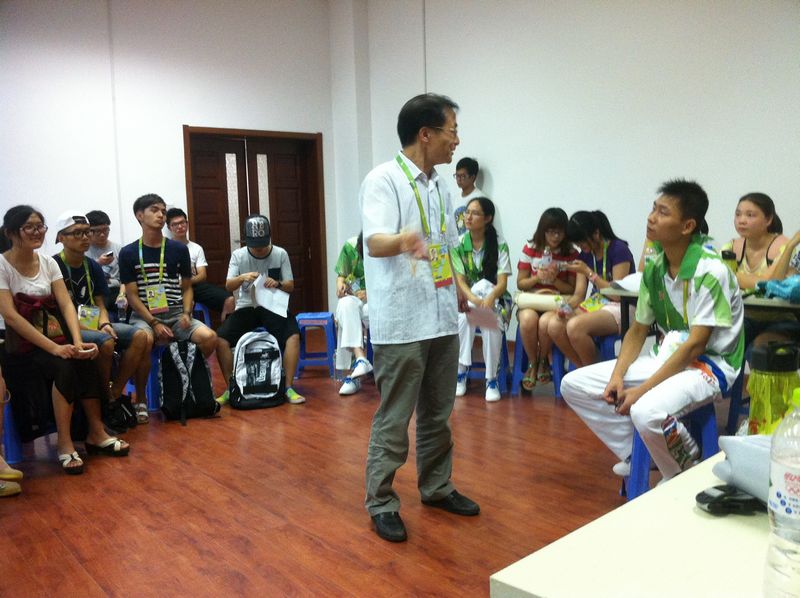 由体育部党总支书记、本届手球比赛观众服务经理陈建华老师主讲,陈老师首先代表南工大手球比赛团队向全体观众服务志愿者的到来表示了热忱的欢迎,感谢大家加入到比赛的服务工作之中,在就有关工作进行了详细说明后,重点地向大家阐述了经历本次活动应该多问几个希望达到的目的,不能简单地停留在服务观众,不怕吃苦,努力工作,履行好职责等浅层次上,应该通过这样的经历后,除了更多地了解国际性重大比赛事的组织框架、运行模式、组织精细程度、团队协作等外,还应该对体育的功能和作用有个全新的认识,并从行动上积极地参与体育、热爱体育、重视运动上,力求在大学里更加自觉地落实好“每天锻炼一小时,健康工作五十年,幸福生活一辈子”号召,用志愿者示范行动带动全民健身,为活跃学校体育文化多做贡献。讲授中不时地用自己的亲身经历,谈南京举行亚青会和青奥会的现实意义。