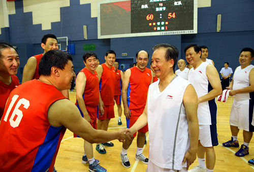 温总理热爱体育,十分爱好篮球运动。2008年,温家宝总理在五棵松体育馆看望中国男篮队员时曾展示了纯熟的三步上篮技术。2011年5月31日,温家宝总理来到北京十八里店小学,和小学生们一起上体育课,参加篮球赛,兑现了“一定和孩子们上一堂体育课”的承诺。今年3月5日,温家宝总理在十一届全国人大五次会议上所作的政府工作报告中明确提出,要“广泛开展全民健身活动,增强人民体质,促进体育事业和体育产业协调发展”。这次又在国庆长假期间,温总理身体力行,百忙之中抽空参加篮球爱好者的友谊比赛,让在场的人们倍感亲切。