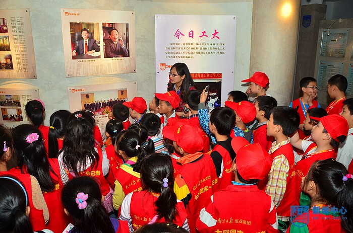 离开了体育馆,校车驶向了天宝阁。一路上经过生化中心、学府苑、象山等地。五月的校园,绿树成荫,鸟语花香,微风拂过湖面,水波粼粼,有一群白色的鹅在湖面悠闲地划开一道道水波,在校广播台同学的讲解下,每个小记者都沉醉在这一片美丽之中。来到校史陈列馆,在老师和学生代表的陪同下,他们粗略地了解了工大的百年发展史,感受到了工大深厚的文化底蕴。而当天正值我校110周岁生日,他们也借此表达了对我校的祝福和对我校的向往之情。看着江浦校区的建筑模型,“学校真大哦,很漂亮!”他们不禁慨叹道。