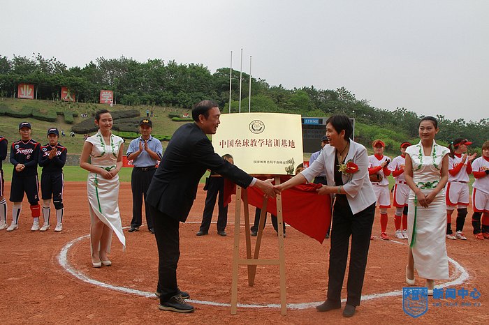 江秀云女士与副校长朱跃钊教授共同为“中国垒球教学培训基地”揭牌。