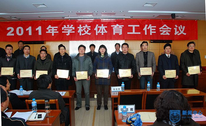 副校长张进明宣读了“关于表彰2010年度体育工作先进集体、先进个人和优秀教练的决定”,学生工作处处长何学军宣读了“关于2010年‘阳光长跑•祖国万里行’冬季长跑活动先进集体和优秀个人的表彰决定”。校体育运动委员会主任、副主任为荣获先进集体和先进个人颁奖。随后,获“体育工作和冬季阳光长跑活动”两项先进集体称号的代表、材料学院党委副书记眭国荣介绍了学院开展师生体育运动的做法和经验。