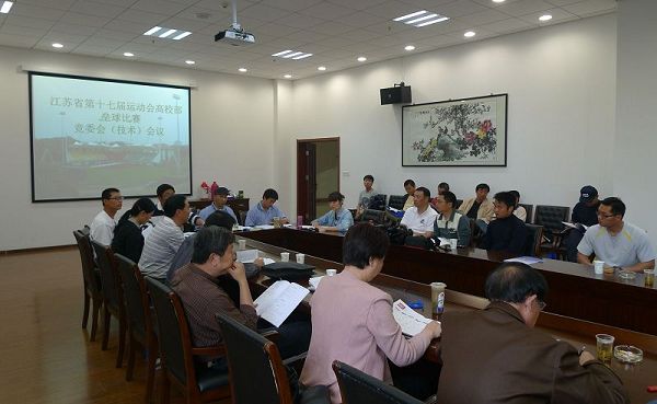 5 月12日下午,江苏省第十七届运动会高校部(甲组)垒球赛竞委会(技术)会议在我校江浦校区新体育馆报告厅举行。出席会议的领导有:江苏省教育厅体卫艺处处长杜伟,江苏省教育厅体卫艺处副处长李海宁,省学生体育协会副主席、本届运动会组委会竞赛部部长庄惠华及参加本届(甲组)垒球赛的兄弟高校的体育部主任等。