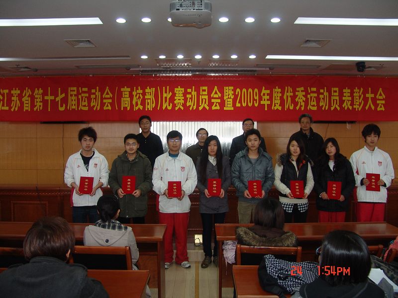 3月24日下午,体育部在江浦校区图书馆五楼会议室召开了参加江苏省第十七届(高校部)学生运动会动员暨2009年度优秀运动员表彰大会,各运动队的全体队员和教练员,体育部党政领导出席了本次动员暨表彰大会。会议由体育部副主任张天峰同志主持。