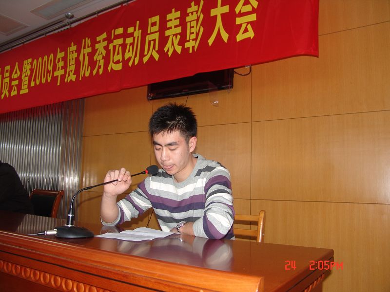 首先,张天峰副主任回顾和通报2009年校各运动队代表学校参加校外各类比赛所取得的优异成绩。侯桂明副主任宣读了2009年度优秀运动员的表彰决定,体育部党政领导为受到表彰的运动员颁发获奖证书。校田径队女队员、获得2010年免试研究生资格的大四学生杭兰旅和校篮球队队员马克同学作为受到表彰的优秀运动员代表,先后结合各自在校运动队训练、比赛经历,谈了心得和体会,可谓情真意切,并表达了在即将举行的省第十七届(高校部)学生运动会上,做到勇于拼搏,力争取得优异的体育竞技成绩,并在比赛过程中充分展现我校学子良好的道德风尚,努力为学校争光,不负学校领导、老师和同学的期望的坚定信心。