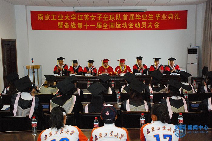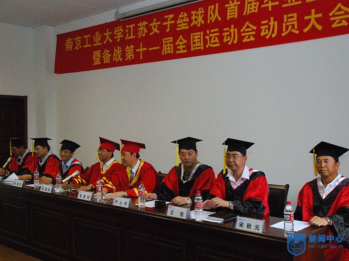 7月7日下午,我校在江浦校区体育馆新闻中心举行了江苏垒球队首届本科生毕业典礼暨垒球队备战十一届全运会动员大会。江苏省体育局领导杨国庆副局长、体育局竞技处严小平副处长、学校朱跃钊副校长、体育部王浩主任、体育部党总支陈建华书记、经济管理学院党委顾永东副书记、垒球队孙谦和李海兵副领队、主教练宋秋元、教练员陈维清等参加了会议。会议由体育部副主任侯桂明同志主持。