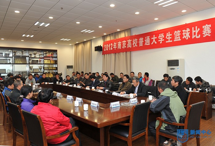 由江苏省学生体协高校工作委员会南京分会主办、我校承办的2012年南京高校普通大学生篮球比赛,于11月27日至12月16日在分别在各有关高校和我校江浦校区举行。参加本次比赛的共有40支在宁高校普通大学生篮球代表队,分为男、女甲组(本科院校组),男、女乙组(高职高专组)四个组进行比赛。11月22日下午在我校江浦校区体育馆会议室召开了裁判长、领队、教练员联席会议,南京工业大学副书记、副校长高明,江苏省学生体协高校工作委员会南京分会主任、河海大学体育部主任王建民,江苏省学生体协高校工作委员会南京分会副主任薛雨平,裁判长、南京医科大学体育部主任李正,南京农业大学体育部主任张禾,南京工业职业技术学院体育部主任曹锦飞等参加了会议,会议由校体育部主任张天峰主持。